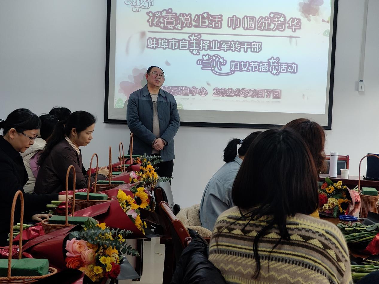 在“三八”妇女节来临之际,为丰富自主择业军转干部女性群体的文化生活,3月7日下午,蚌埠军转干部培训分中心自择办组织安置在该市的女性自主择业军转干部开展插花活动。