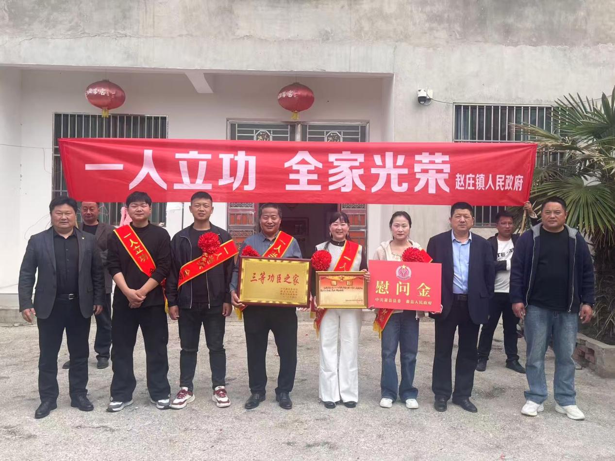 近日,为荣立三等功的现役军人孙超送喜报的队伍走进萧县赵庄镇建华村,给其家属送上立功喜报、“三等功臣之家”牌匾与慰问金,让军人军属共同分享这份荣耀。