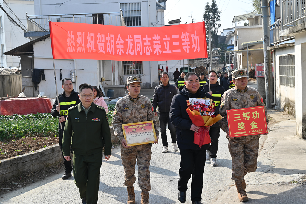 1月23日上午,祁门县人武部部长卢程率队为荣获“先进老干部工作者”称号的军人方祎龙和荣立三等功的军人胡余龙的家庭送去立功受奖喜报。