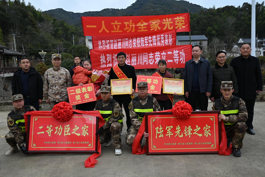 2月9日,祁门县委书记、县长江成永率队为荣立二等功和首届陆军先锋的军人赵丽川家庭送去喜报,县人武部部长卢程和县有关部门负责同志参加。