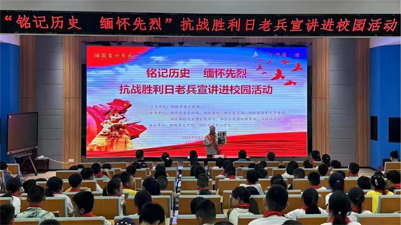 9月3日,“铭记历史•缅怀先烈——‘抗战胜利纪念日’老兵宣讲进校园”活动在郊区新建中心学校举行。活动由铜陵市委宣传部主办,郊区区委宣传部、郊区退役军人事务局承办,铜陵市光荣院协办。