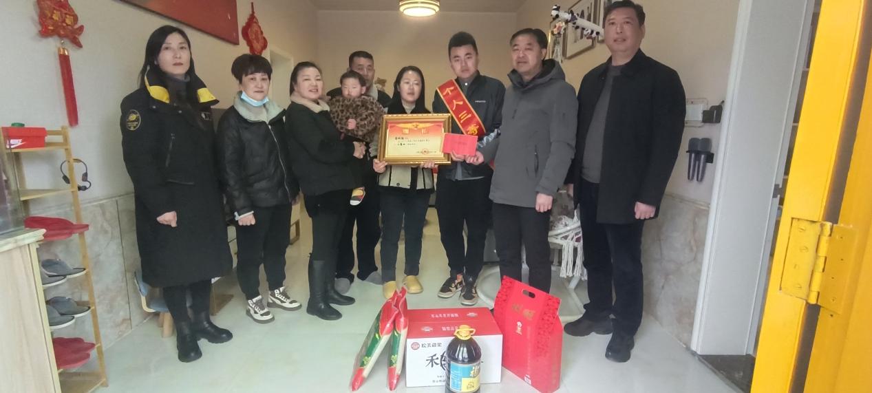 2月22日上午,在合肥市蜀山区小庙镇拐岗社区“两委”成员的陪同下,小庙镇退役军人服务站站长李广定将“三等功”喜报及慰问品送至现役军人黄晓强家中。