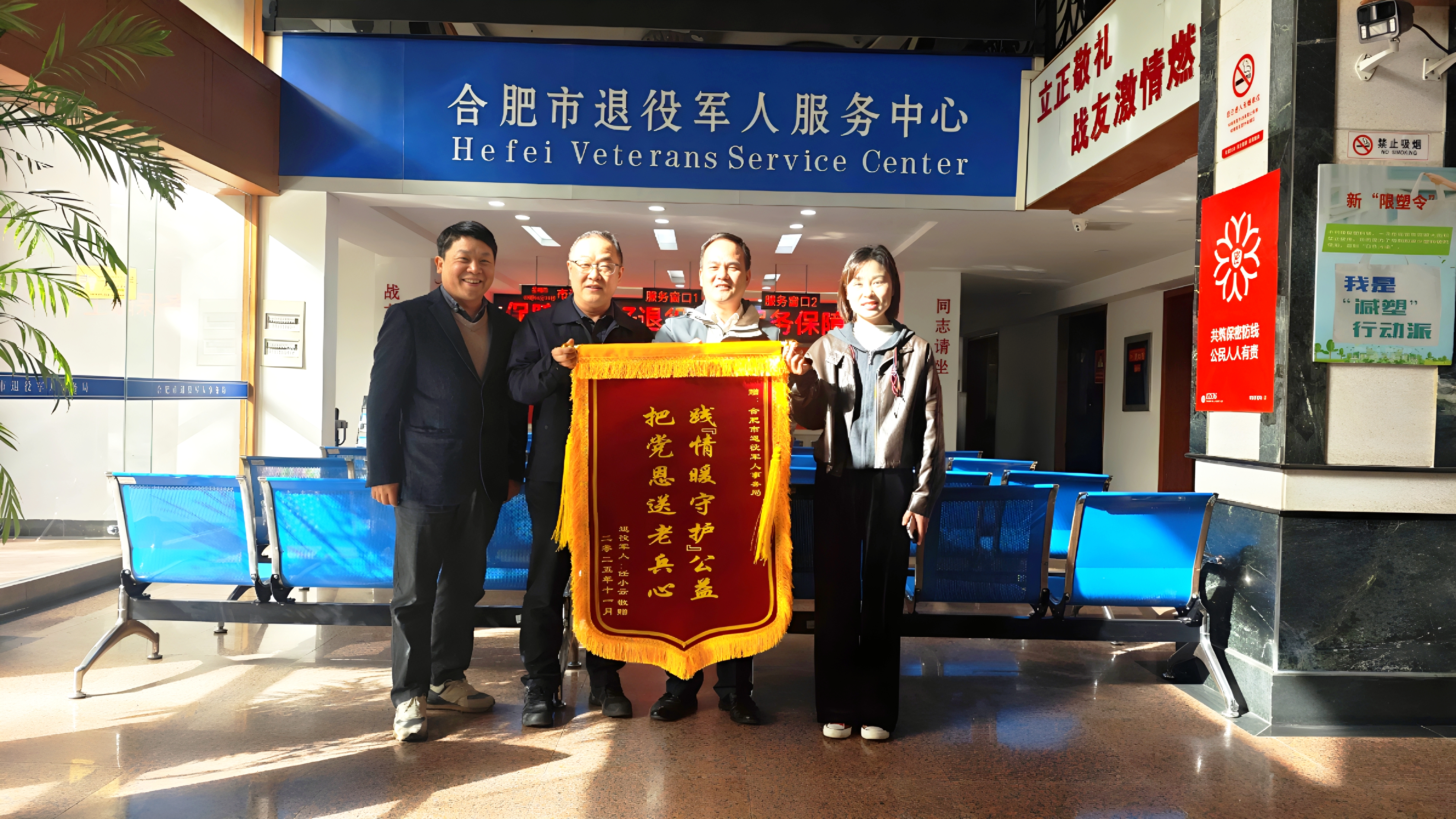 11月27日上午,庐江县退役军人袁某将一面印有“践情暖守护公益 把党恩送老兵心”的锦旗送至合肥市退役军人事务局,对“情暖老兵 守护光明”公益行动表示感谢。