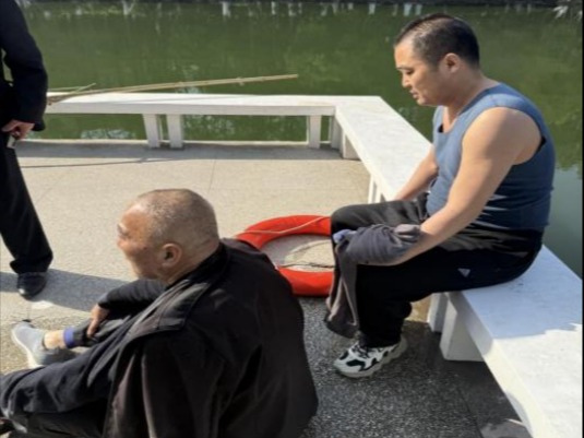 将老人救上岸后,已经筋疲力竭的史习建同志仍然默默地坐在获救老人身后,等待公安民警和120急救到场处置。