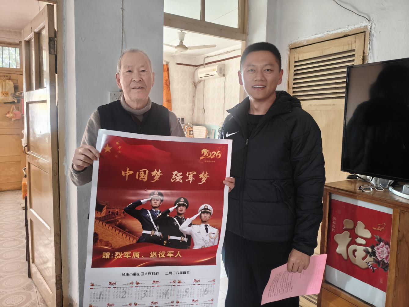 1月5日,合肥市蜀山区三里庵街道竹荫里社区退役军人服务站工作人员开展走访退役老兵活动,为辖区退役军人家庭送年画与《致蜀山区广大烈军属和退役军人的一封信》,将新春祝福与关怀温情送达。