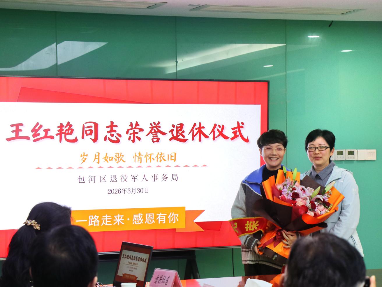 3月30日,在全区退役军人事务工作会议上,合肥市包河区退役军人事务局为即将光荣退休的包公街道退役军人服务站站长王红艳同志举行了一场简单而温馨的退休仪式。