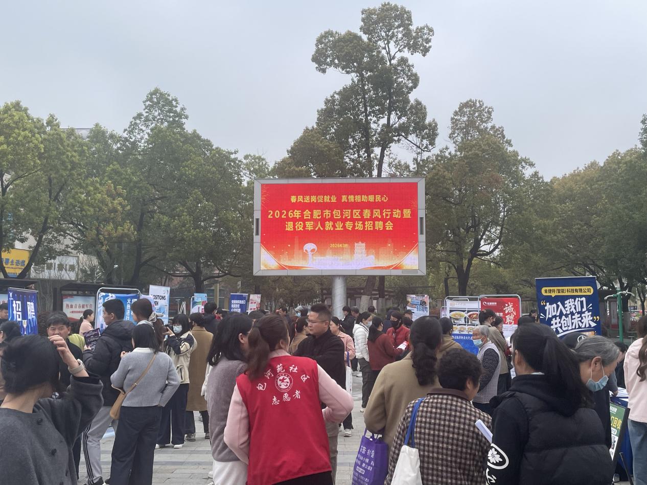 3月31日上午,2026年合肥市包河区春风行动暨退役军人就业专场招聘会在包河苑社区志愿服务广场成功举办,活动为企业与求职者搭建起精准对接的暖心桥梁,让就业服务直达群众“家门口”。