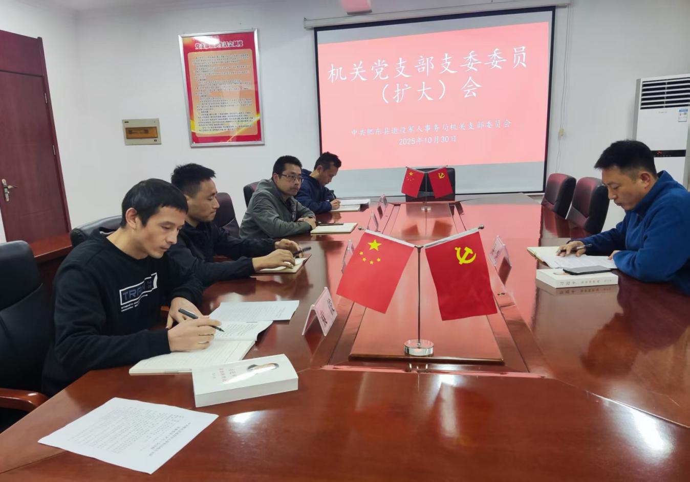 10月30日下午,肥东县退役军人事务局机关党支部召开10月支委委员(扩大)会议。支部支委委员、党小组长参会,机关党支部书记主持会议。