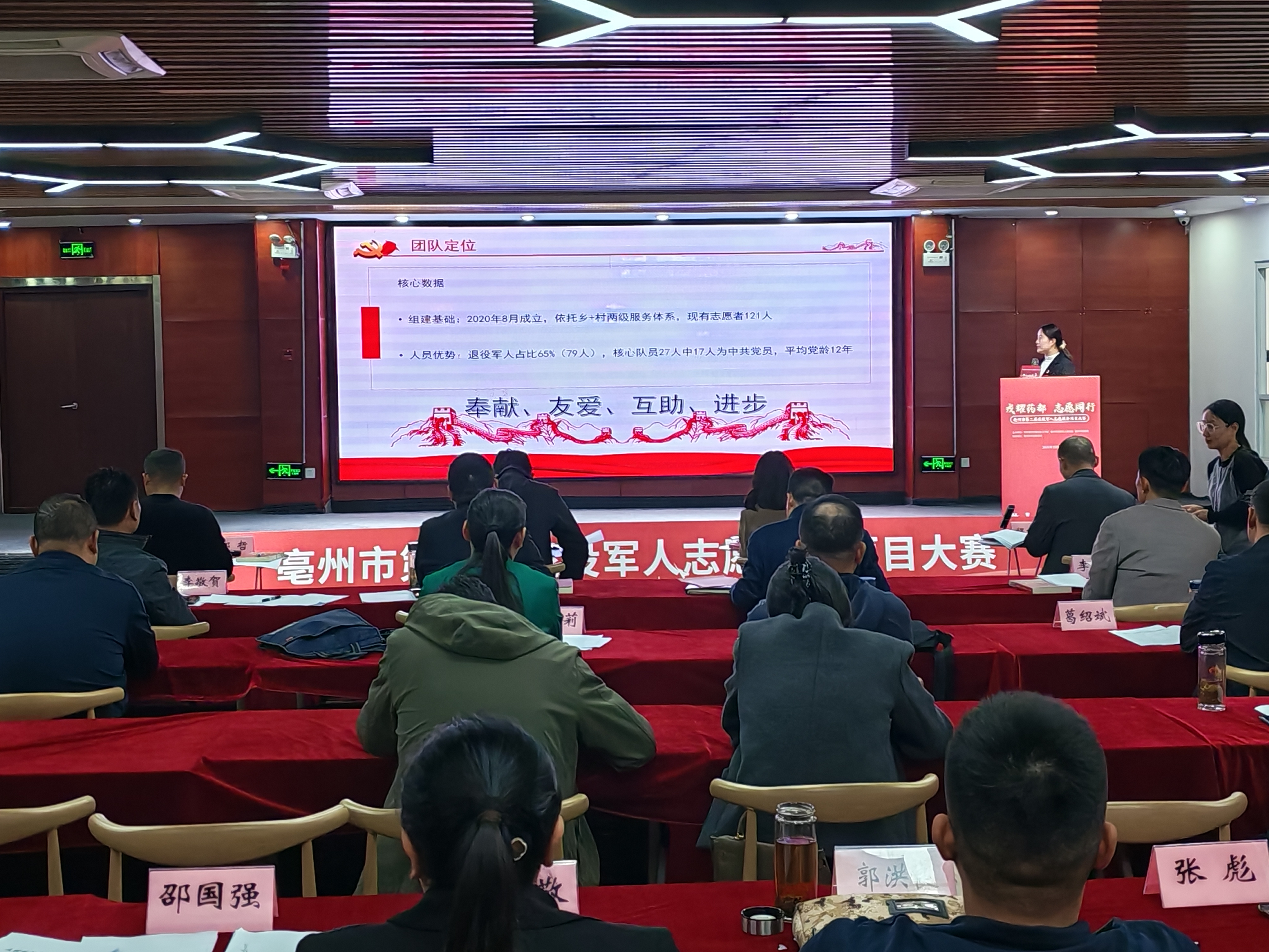 10月29日,从亳州市第二届退役军人志愿服务项目大赛现场传来喜讯,利辛县纪王场乡退役军人“红耀江淮”志愿服务队凭借其扎实的工作和突出的成效在比赛中荣获三等奖!
