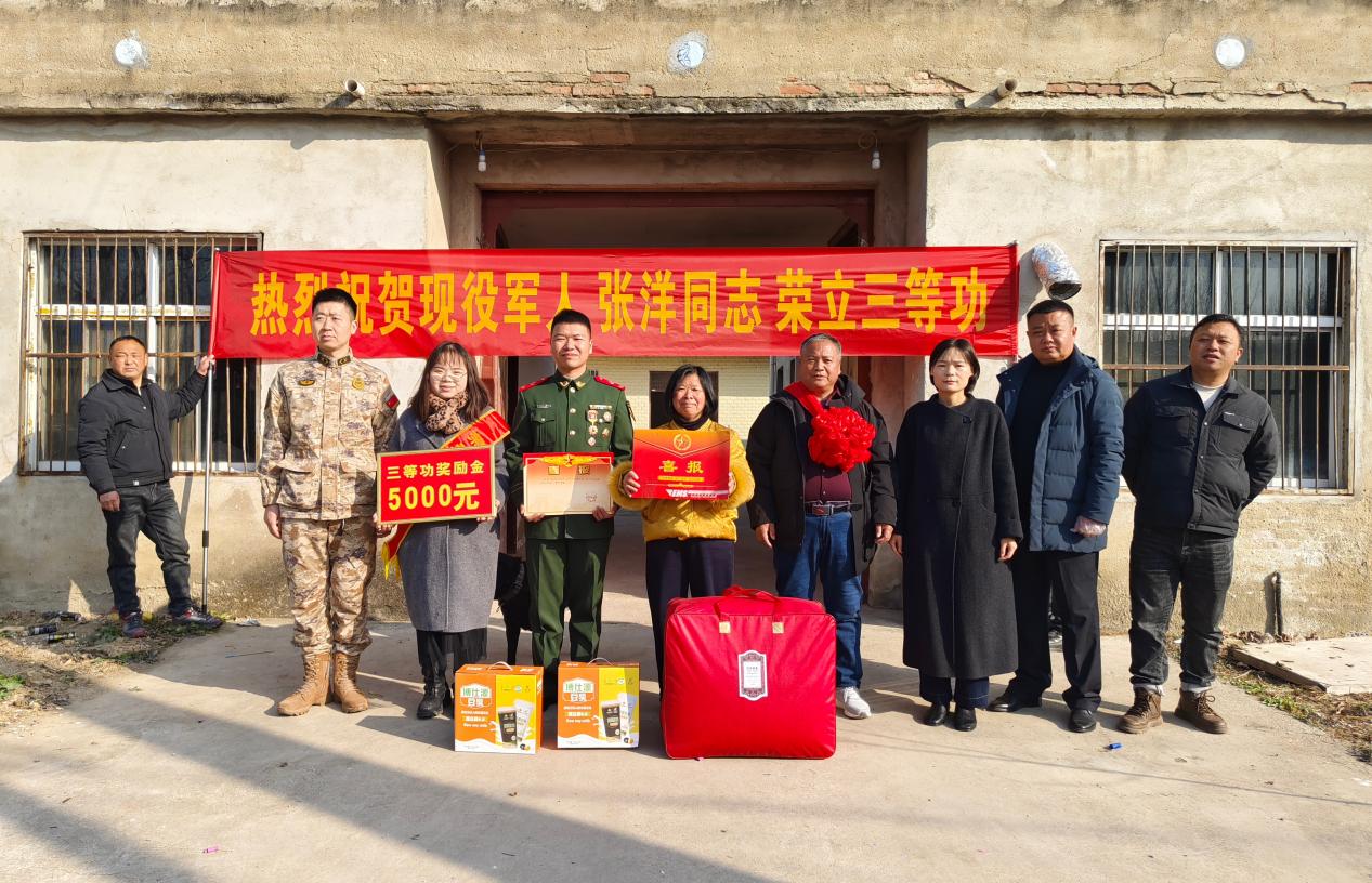 2月14日上午,宿州市埇桥区大泽乡镇武装部、镇退役军人服务站,来到张桥村,为在部队表现突出、荣立个人三等功的现役军人张桥村张洋家庭送去立功喜报和慰问金。