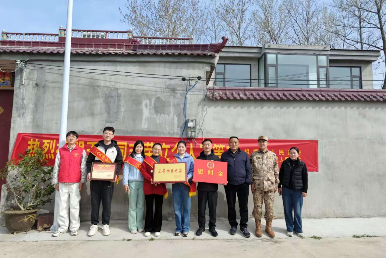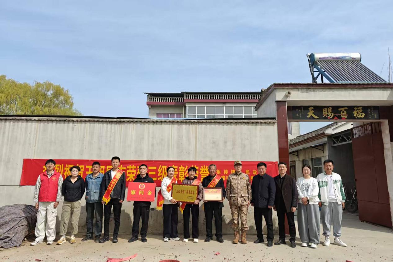近日,萧县祖楼镇党委书记吴英、人武部长胡斐带领镇退役军人服务站工作人员一行来到王楼村,为荣立三等功的现役军人王奎家庭送去喜报和慰问金,将党和政府的关怀与温暖送到军属心坎上。