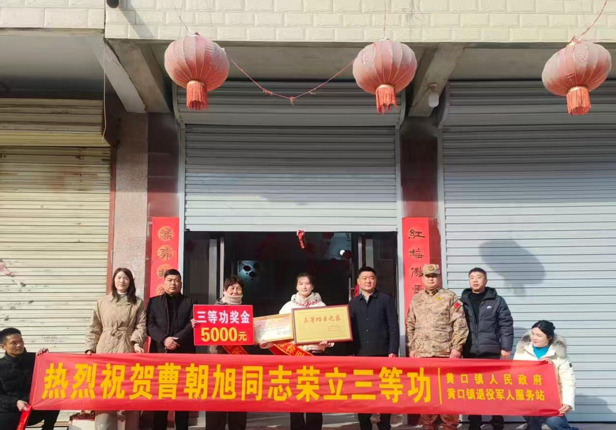 2月12日,萧县黄口镇党委书记张全振带队专程来到镇西社区,为荣立军功的现役军人曹朝旭家属送去立功喜报、慰问金和慰问品。