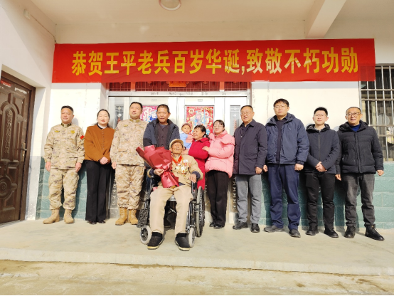 1月6日,潜山市人武部、市退役军人事务局及五庙乡党政主要负责人等军地领导赴五庙乡走访慰问抗美援朝百岁老兵王平,送上党委政府的关心关怀和百岁生日美好祝福。