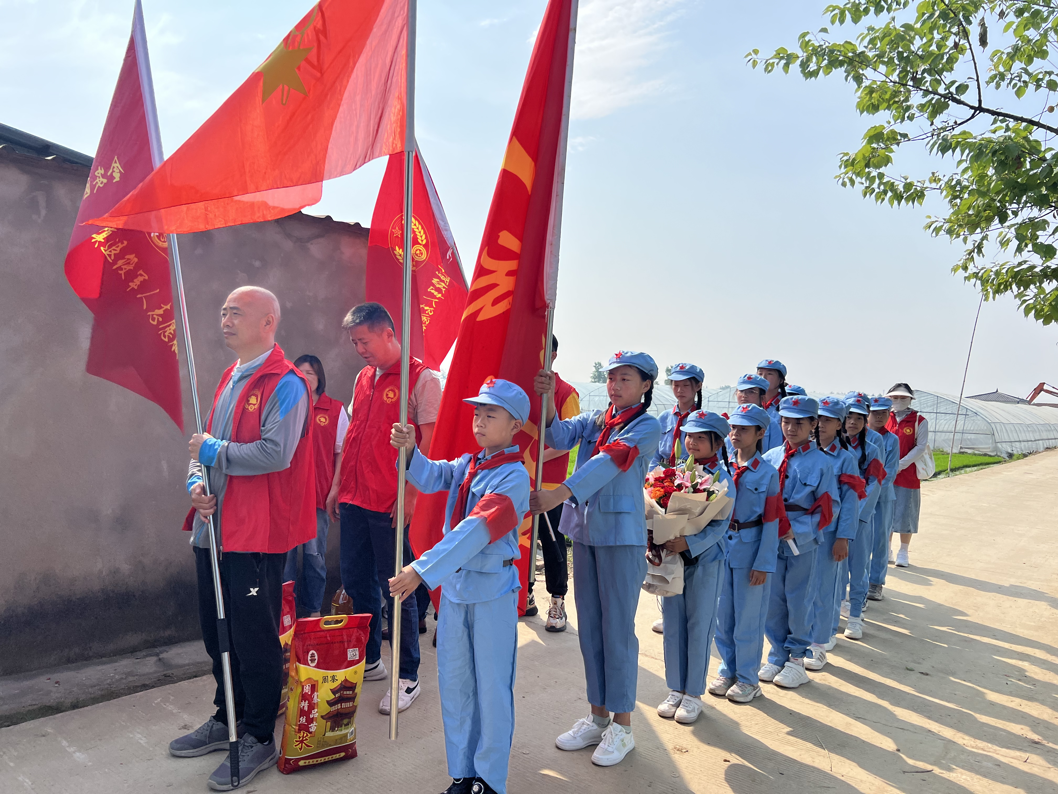 当地退役军人“红耀江淮”志愿者服务队为杨春江戴好党徽及军功章,送上米、油等慰问品。少先队员代表为杨春江戴好红领巾并献上献花,向他们心中的英雄敬少先队队礼。