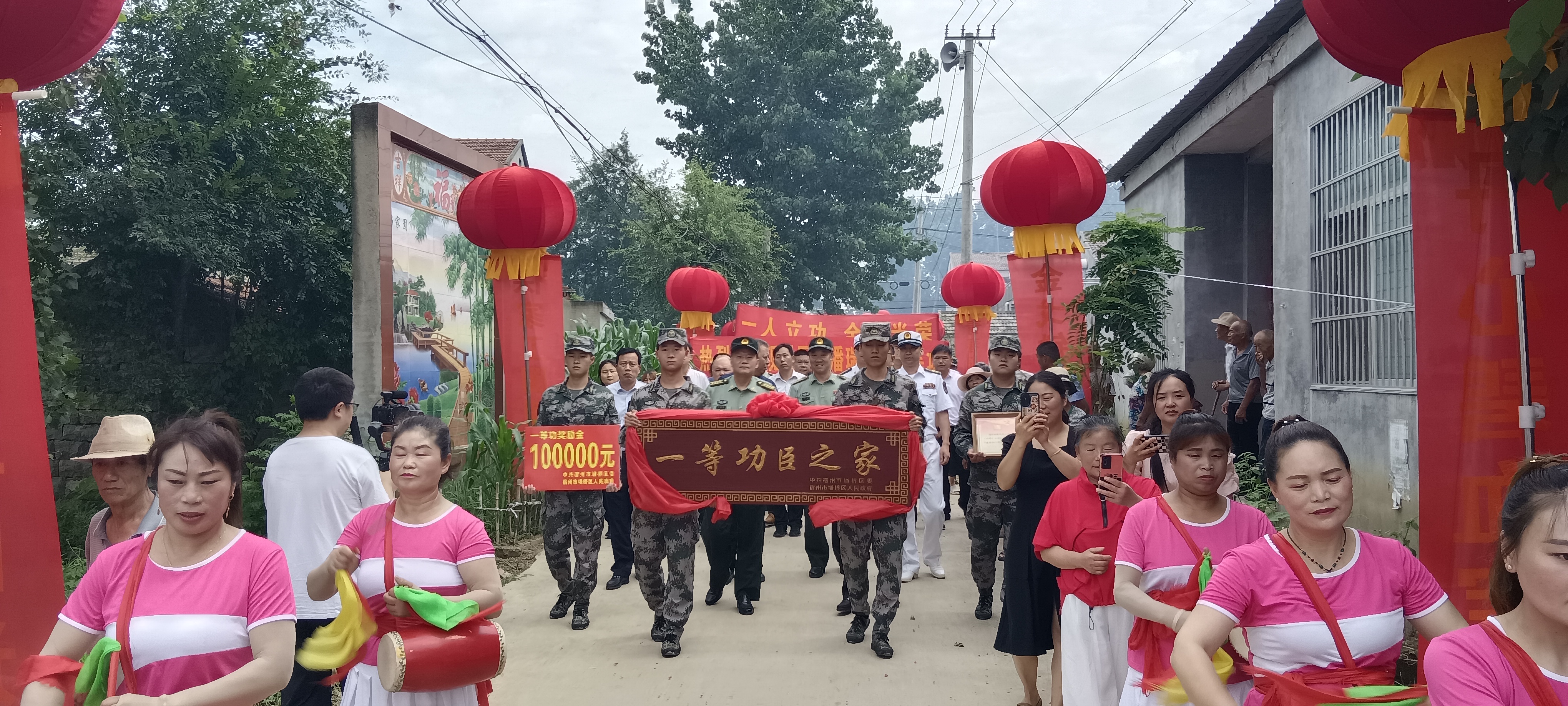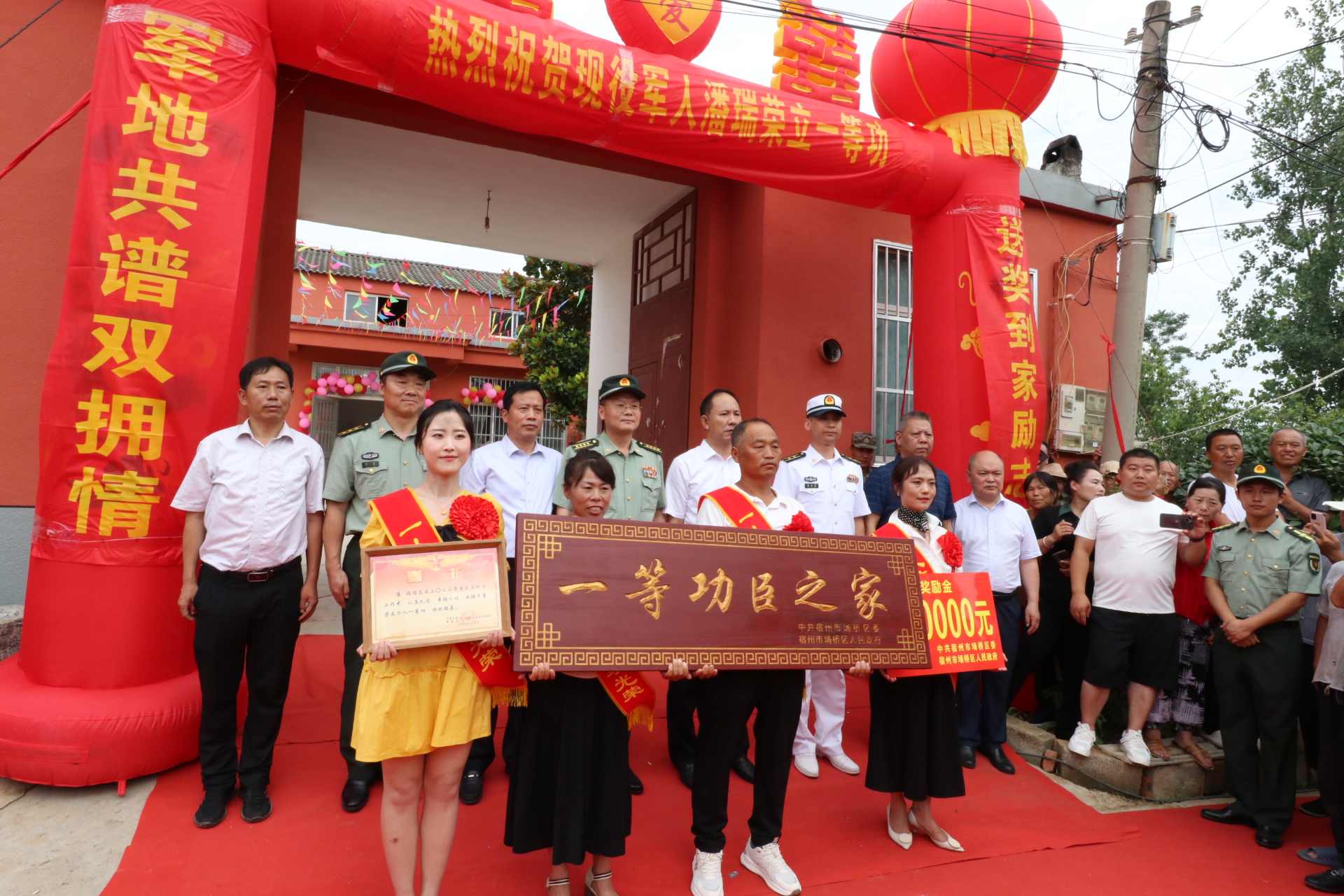 7月6日,位于皖北的偏远小村庄——宿州市埇桥区曹村镇湖庄村锣鼓震天、鞭炮齐鸣,村民们与宿州军分区、市政府领导和潘瑞所在部队的代表,以及市、区退役军人事务局的同志们举行隆重仪式,庆祝现役军人潘瑞荣立一等功。