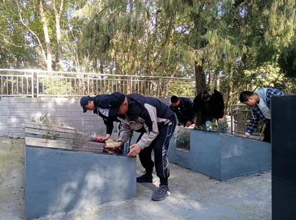 会后组织退役士兵来到烈士陵园打扫卫生,并对烈士墓碑进行清洗描红,迎接清明祭扫的到来。(沈军)