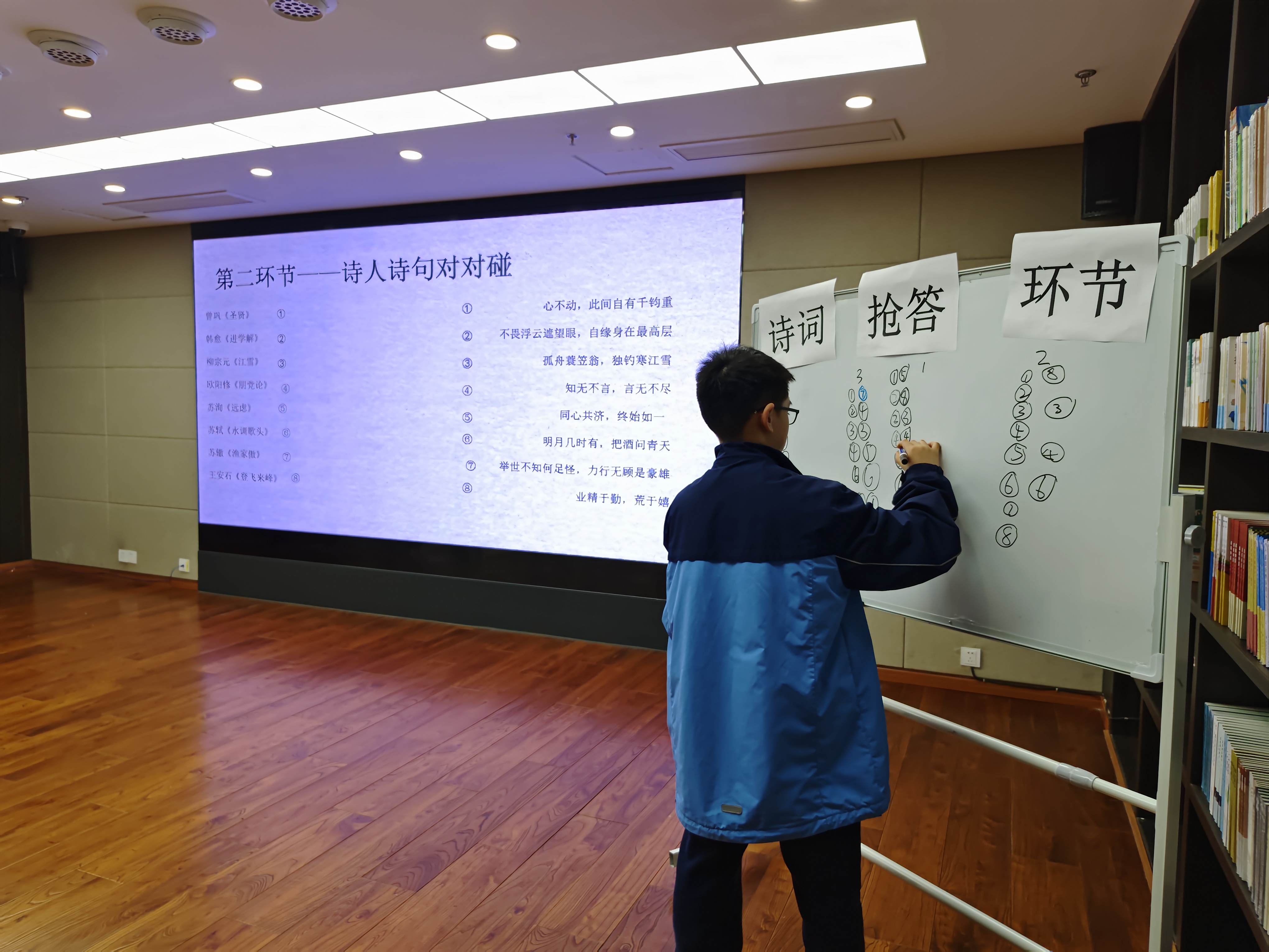 活动中诗人诗词对对碰环节,通过唐宋八大家的代表作品进行一个连线,现场小学生们利用自己的平时所积累的文化常识根据规则一一串联起来;接着古诗词抢答环节,通过七轮诗词竞猜的抢答,不仅可以让现场的学生学习古诗的知识还可以丰富大家的传统文化底蕴,寓教于乐。活动的最后通过以“花”为字的飞花令,大家排起队按照顺序依次回答。最后根据每组情况颁发活动礼品。