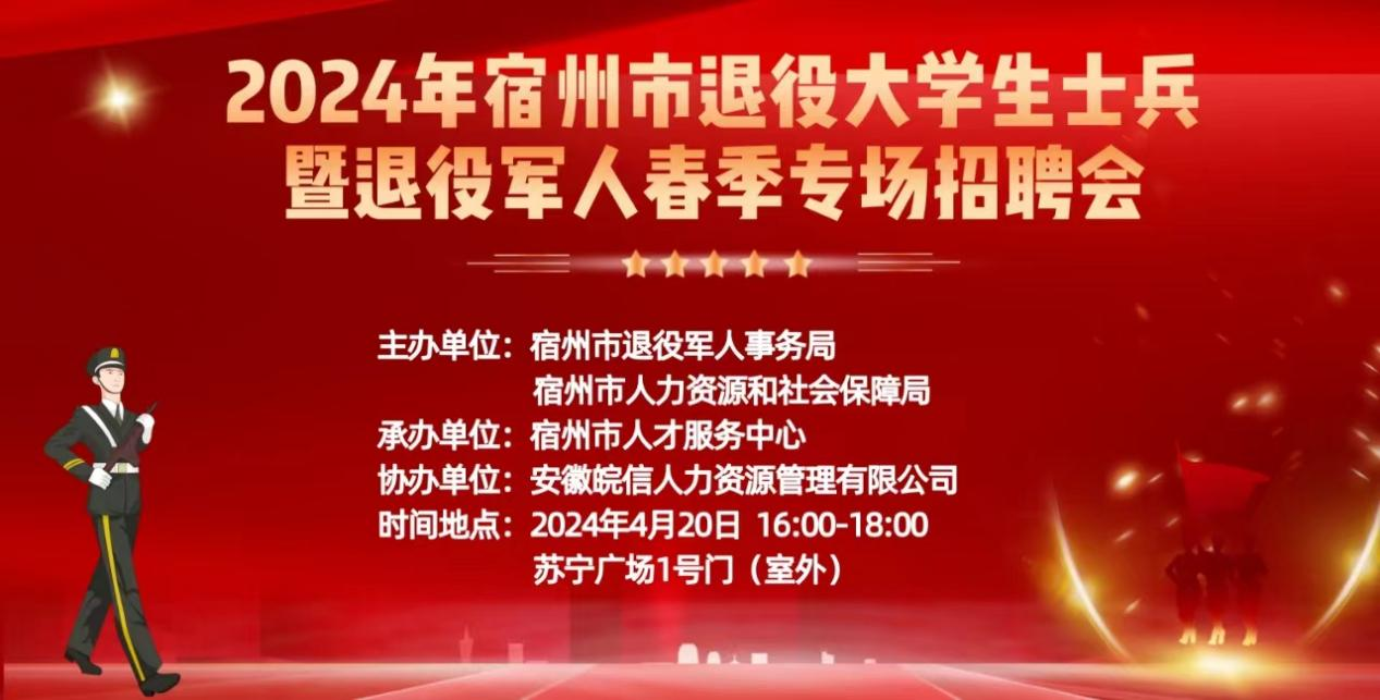 4月20日,宿州市退役军人事务局联合宿州市人力资源和社会保障局在苏宁广场举办了“戎耀归皖,扬帆起航”2024年退役大学生士兵暨退役军人春季专场招聘会,招聘会吸引了60余家单位参与,提供1000余个岗位,主要涵盖新材料、信息、通信等多个行业领域。