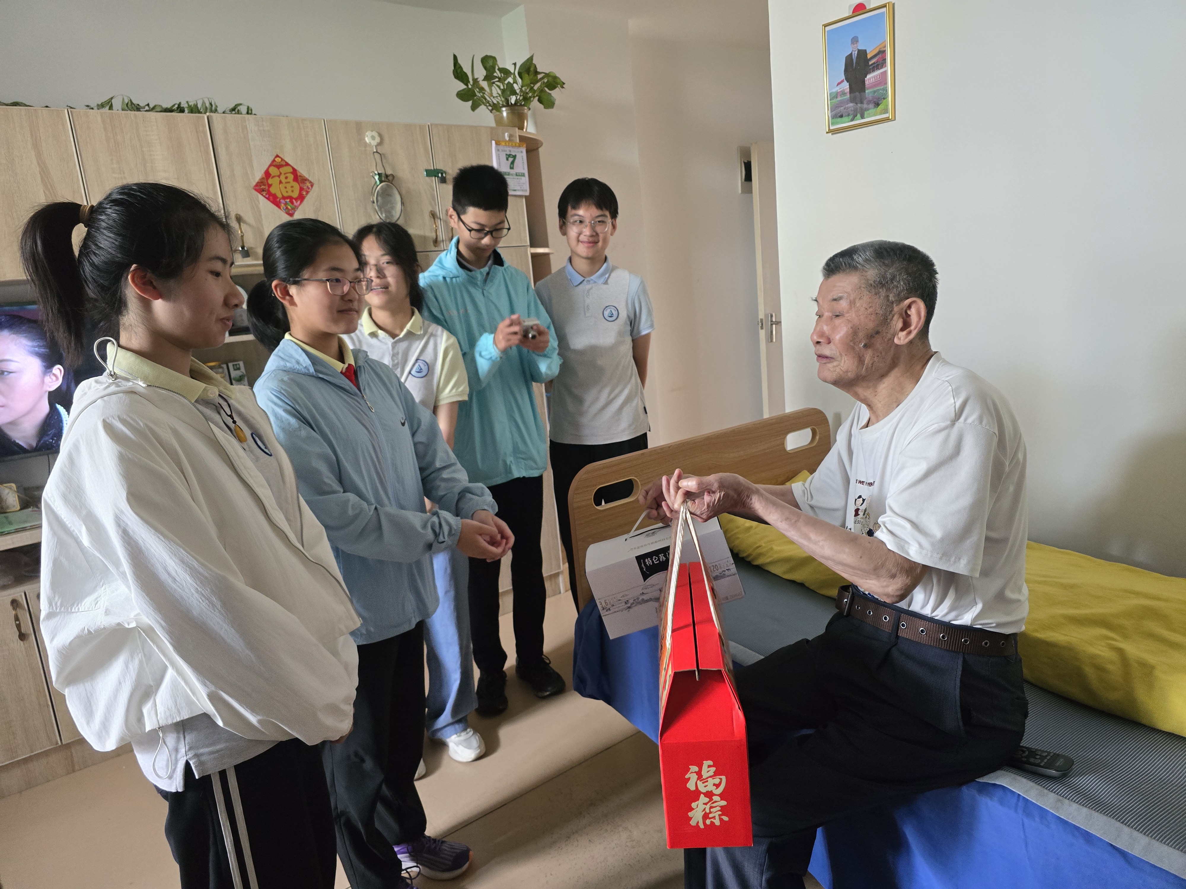 活动当天,学生志愿者们走进竹园养老院,为养老院里五保户老人送去关爱和温暖。在院长的带领下,学生们围绕在老人的身边,陪老人慢慢交谈,嘘寒问暖,了解老人们的生活情况和身体状况,叮嘱他们安心养老。听到老人们说:“我们很满意现在的生活,吃得营养,住得舒适。”学生们脸上泛起了微笑。同时,学生们亲手为老人们送上牛奶和粽子,祝福老人们端午安康,幸福长寿。