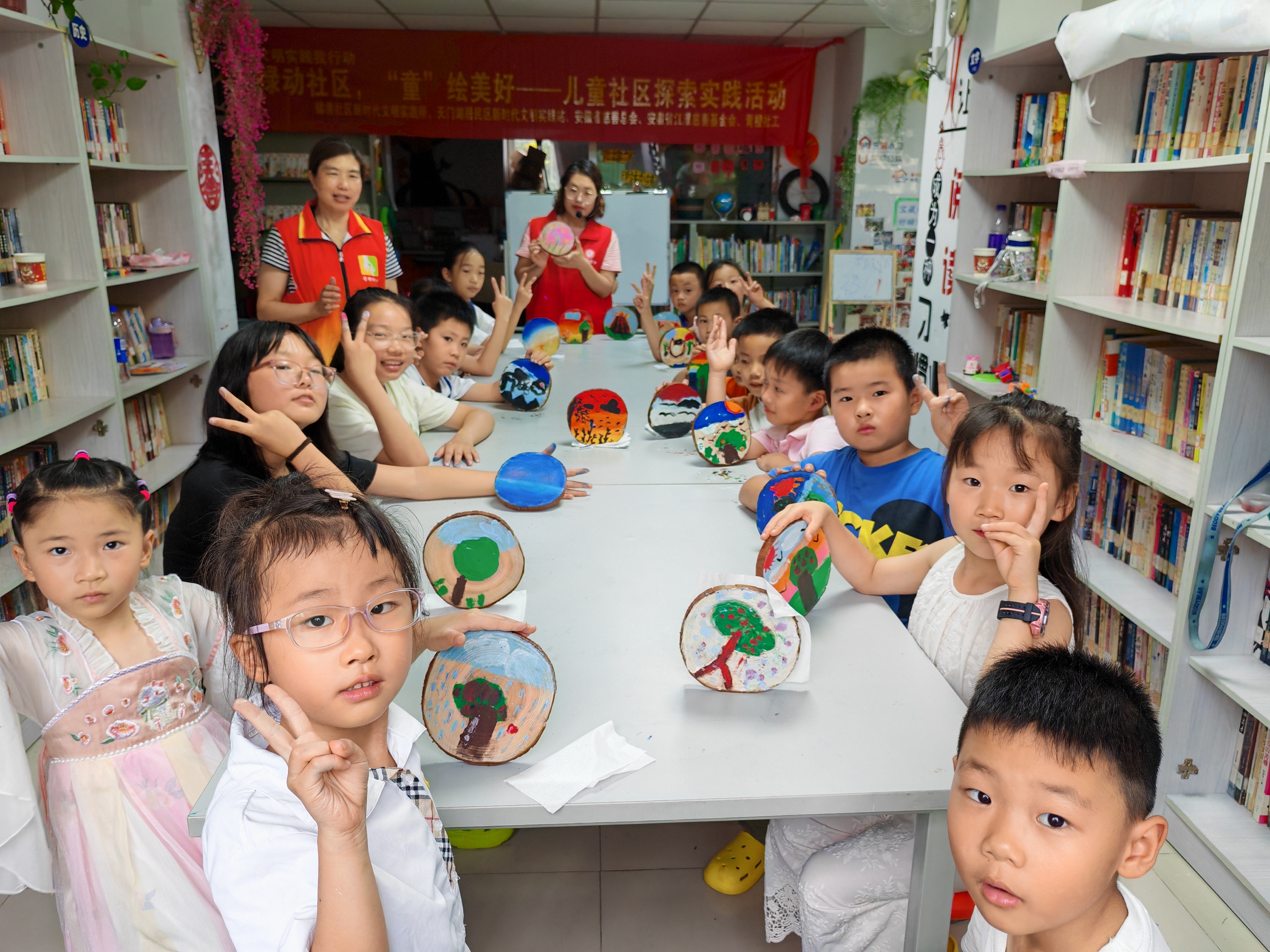 探索完小区的环境,孩子们返回图书馆,开始讨论并创作,孩子们将观察到的景物,在普通的木片上绘制出一幅幅色彩斑斓、充满童趣的画作,有的画作描绘了社区绿树成荫的景象,有的则展现了孩子们在游乐设施上嬉戏的欢乐场面,有的绘画出来自己理想中的社区。