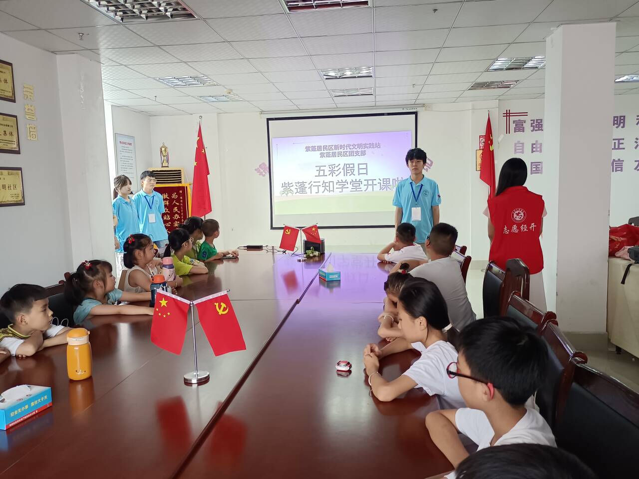为发挥社区公共资源,日前,合肥经开区锦绣社区紫蓬居委会携手合肥师范学院青年志愿者秉持着“兴趣培养,视野拓展,知识丰富”的理念,在紫蓬居委会三楼开展了行知学堂暑期实践活动。本次行知学堂的开展,严格按照建设标准,由六名小先生组成。旨在利用暑假时间,让更多的孩子能够将假期充分地利用起来,于学中乐,于乐中学。让暑期无人看管的孩子降低安全隐患,同时也让更多的孩子能拓展视野,进一步成长。