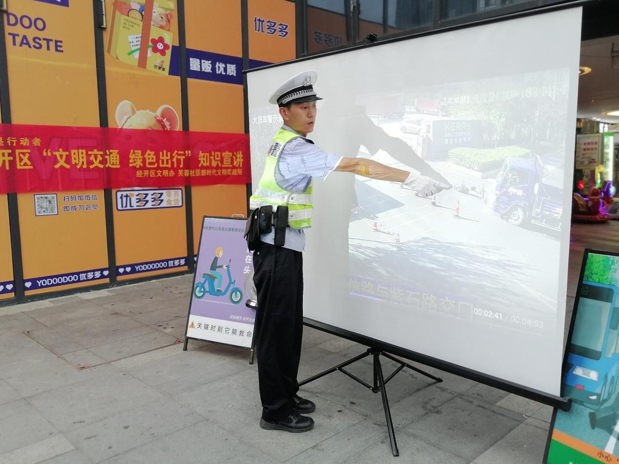 活动邀请了合肥市经开交警一中交警金志鹏现场宣讲。金交警通过讲解道路安全知识、播放警示教育片、趣味互动等形式为居民们送上了一堂入脑入心的交通安全教育课。金交警结合合肥市车祸事故典型案例,从酒驾醉驾、无证驾驶、超员、超载、违法载人、骑乘摩托车不戴安全头盔等交通违法行为带来的危害性及后果以及大货车的视线盲区等方面进行了详细讲解。案例中再现的一幕幕触目惊心的交通安全事故的惨痛教训给现场观看人员带来了强烈的视觉冲击和心灵震撼。最后金交警通过互动游戏、有奖问答的方式,再次提醒大家一定要遵守交通安全法律法规,现场大朋友、小朋友都积极参与其中,气氛热烈。