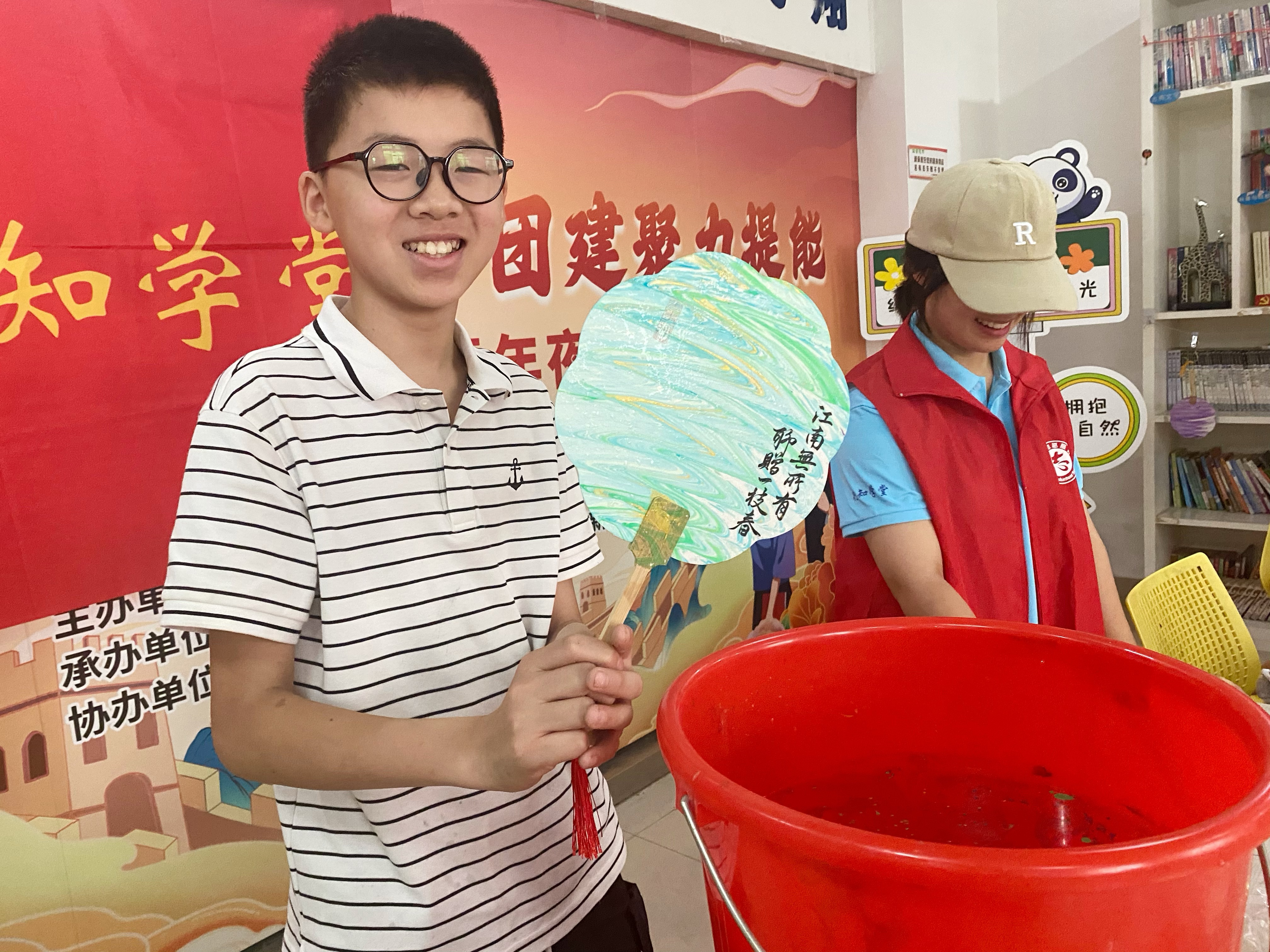 活动开始前,行知学堂的志愿者为小学员们讲述了漆扇的概念、种类和制作过程等内容,使孩子们对漆扇有了一定程度的了解。随后,孩子们在志愿者的指导下,将喜欢的漆色滴入水桶中,用搅拌棒搅动水面,形成随机变幻的纹路,再把扇子垂直浸入水中,将扇面染上彩漆,慢慢提出扇子。这时,扇面形成如同星云、河流、海洋等色彩斑斓的图案。最后,孩子们将漆扇表面多余的水分用纸巾擦去,小心翼翼地将扇子捧在手中,一件漆扇作品便呈现在眼前。孩子们不由得发出一声声惊叹,被漆扇带来的视觉效果所折服。