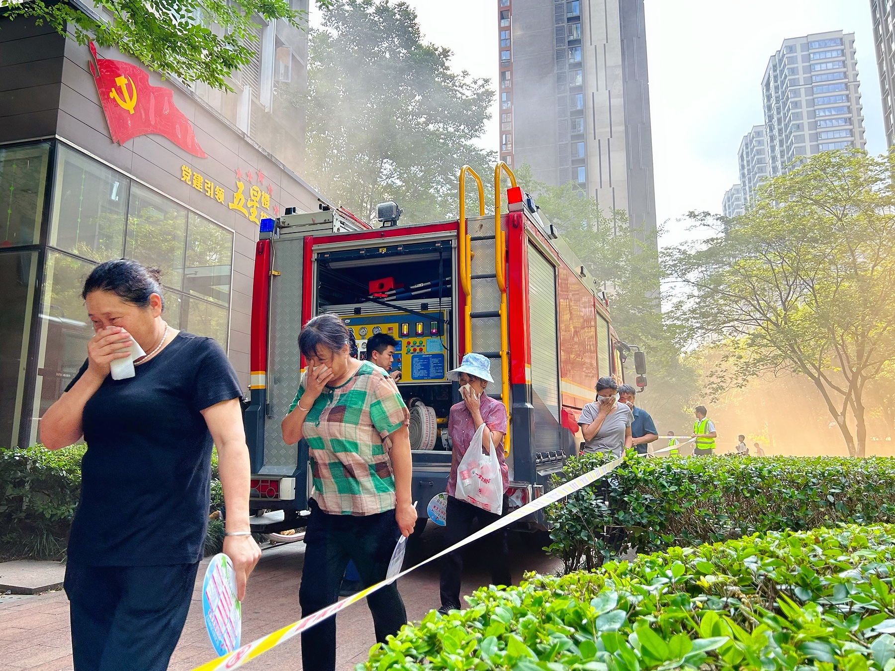 火灾应急疏散演练模拟了融祥园小区18号楼发生火灾事故。模拟火灾场景中,浓烟滚滚,警报声响起,居民们在消防人员和物业工作人员的引导下,用湿毛巾捂住口鼻,弯腰低姿,迅速而有序地从“火灾现场”撤离到安全地带,整个疏散过程紧张而有序。