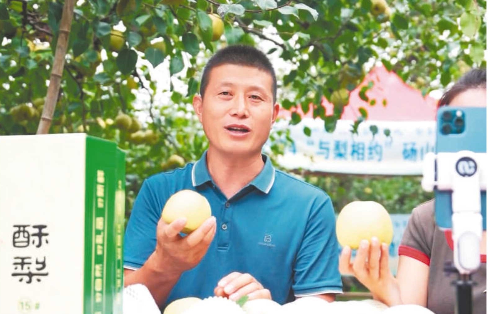 当了22年兵的王小辉,2017年退役回到家乡砀山县,利用电商平台成功把砀山酥梨等家乡农特产品推向全国。图为王小辉直播介绍砀山酥梨。砀山县退役军人事务局供图