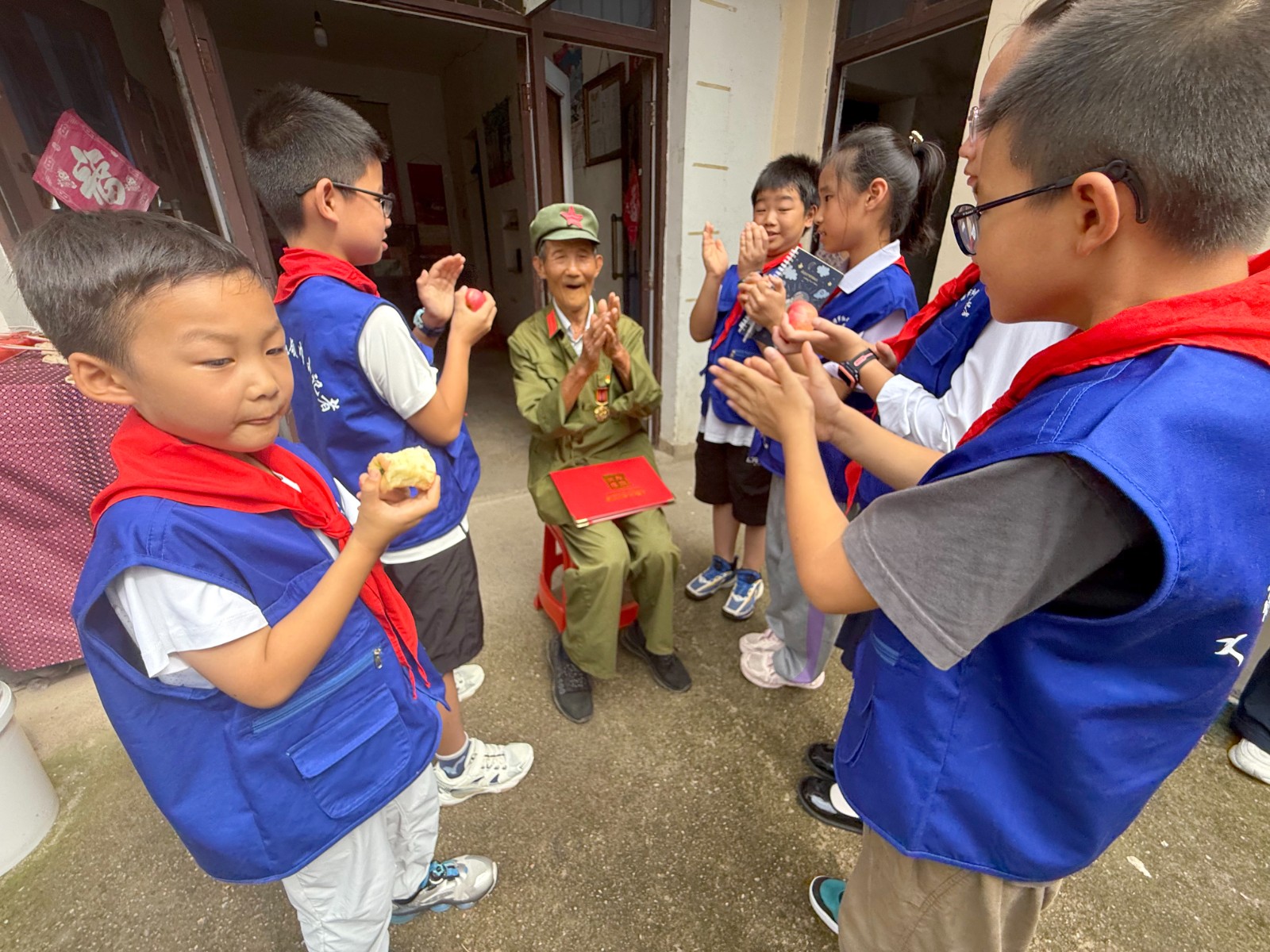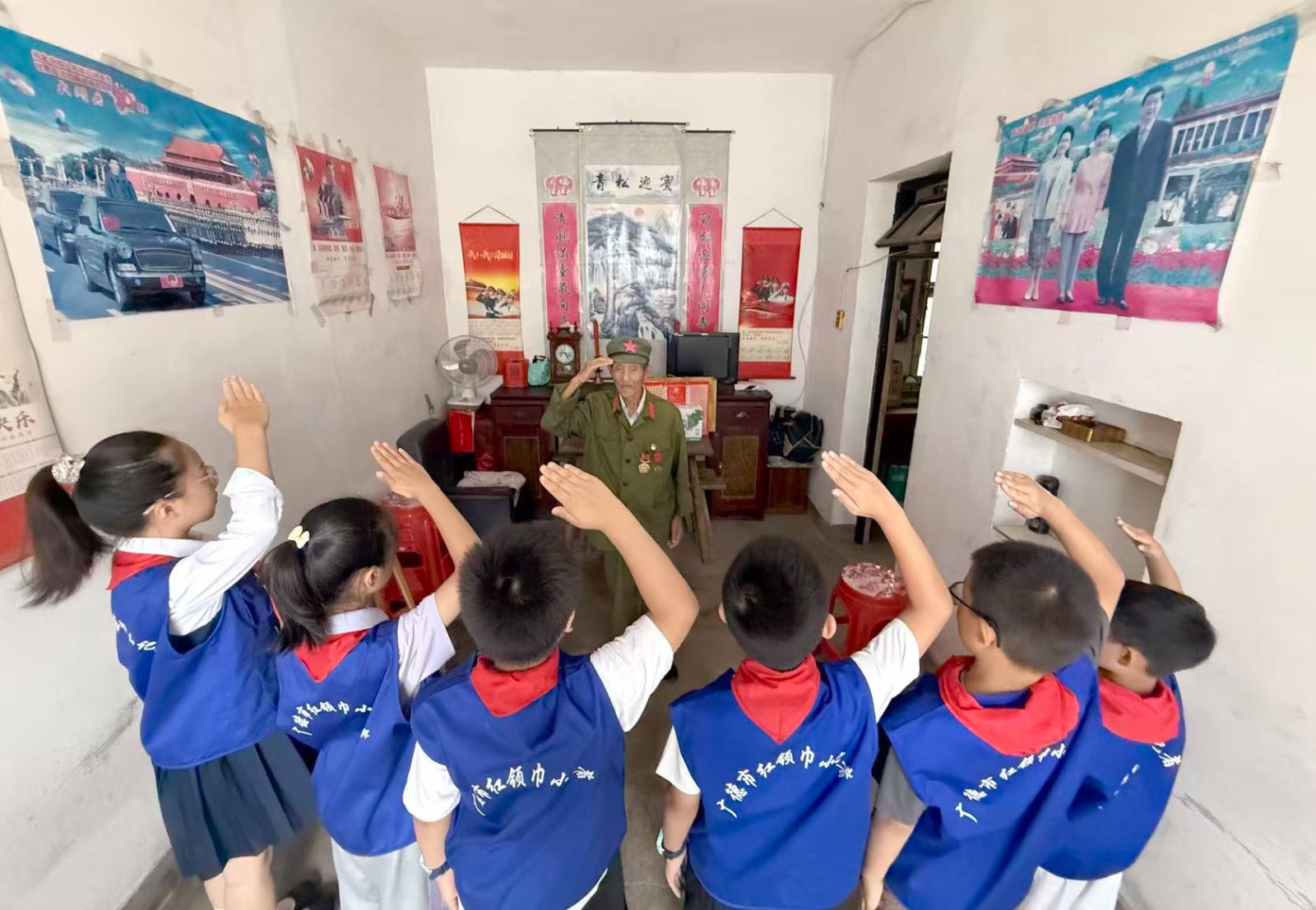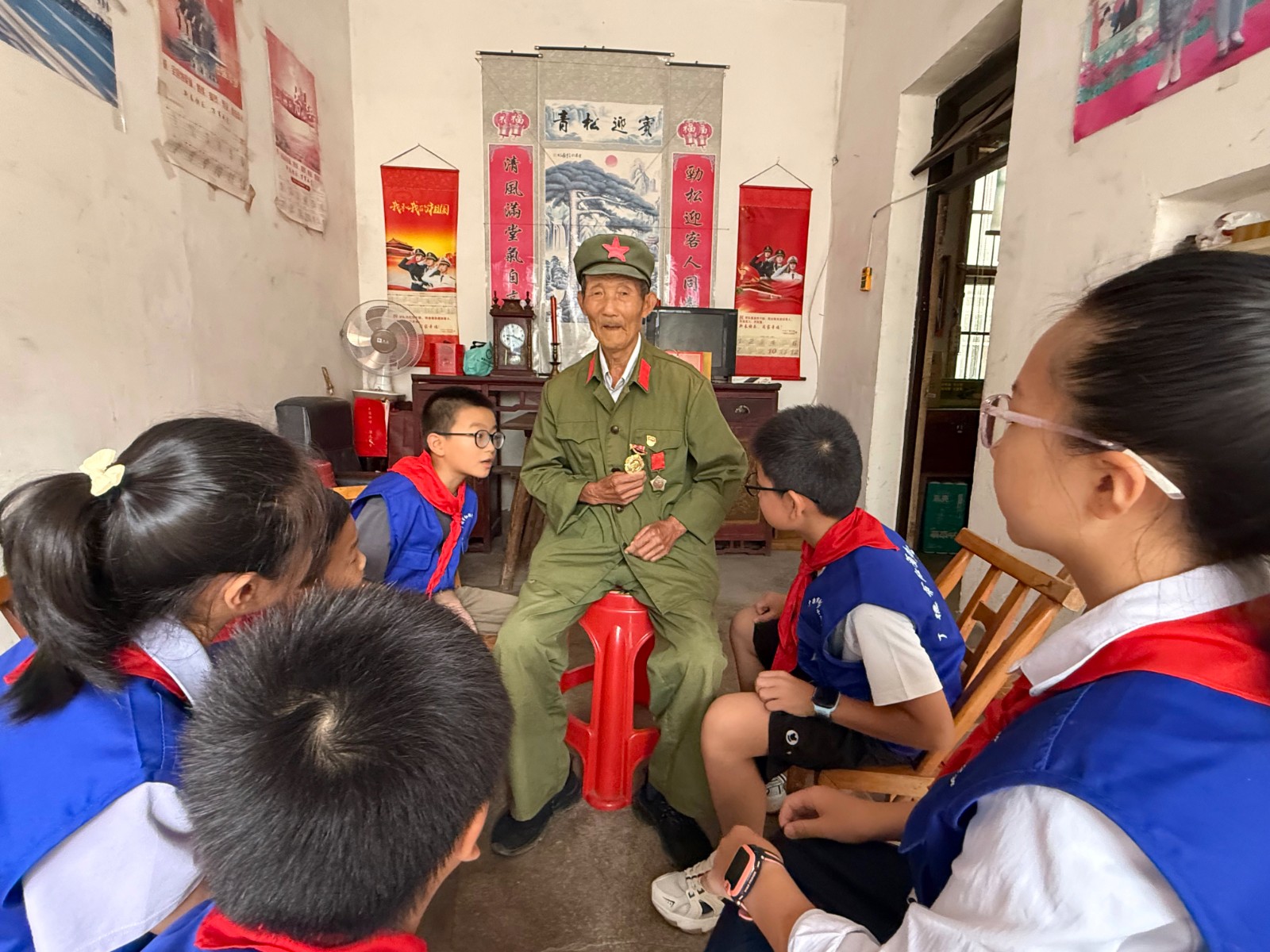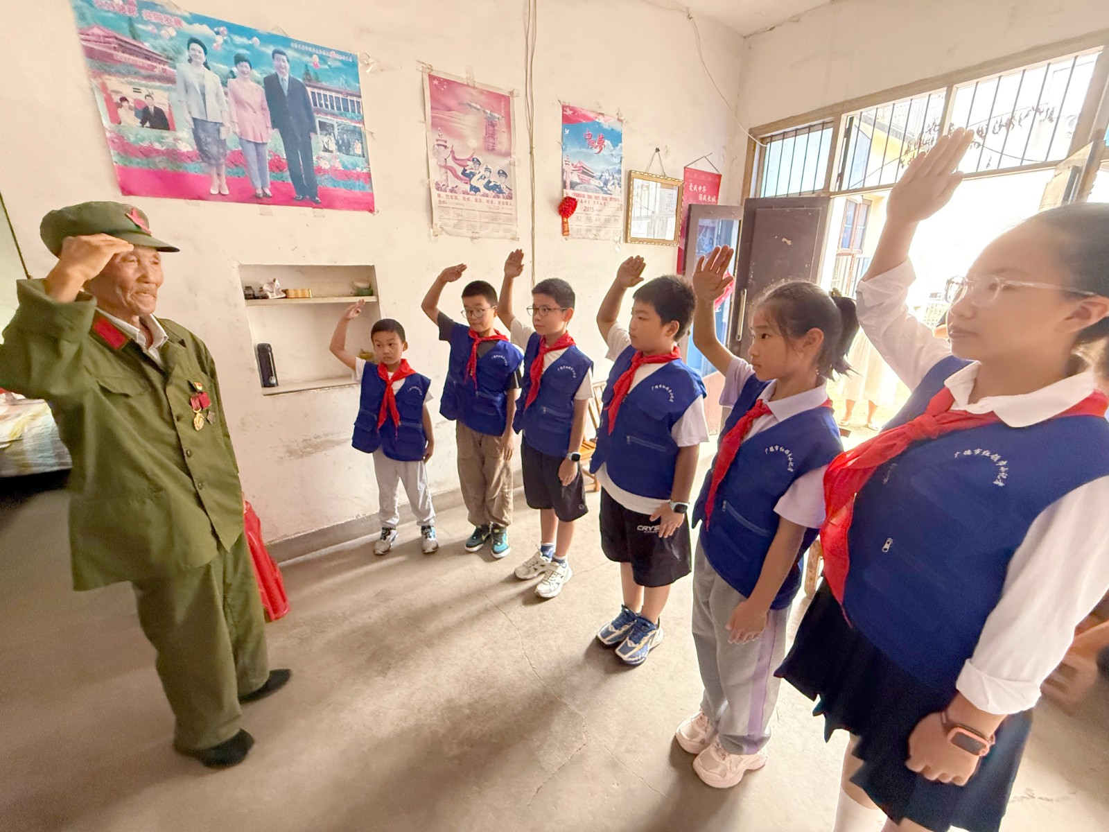 金秋的皖东南群山如黛,广德市卢村镇的竹林在微风中舒展枝叶,将细碎的阳光洒向一间寻常农舍。9月27日,在全国国防教育月活动深入开展之际,广德市退役军人事务局与共青团广德市委联合组织的红领巾小记者团踏着晨露而来,92岁抗美援朝老兵解吾喜家的堂屋瞬间被稚嫩的身影填满。这场以“新老衔接忆峥嵘,薪火相传强国防”为主题的实践活动,让烽火岁月的记忆化作鲜活教材,在少年心中播下爱国强军的种子。