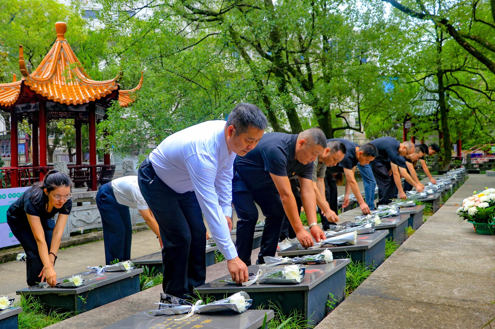 国歌奏毕,主持人庄重宣读烈士评定文件并致悼词,深情回溯先烈们在民族独立、人民解放征程中抛头颅、洒热血的峥嵘岁月,讲述广德“一寸山河一寸血”的革命故事,号召大家“把英烈遗志刻在心里,把烈士精神融入脚下的路”。“全体默哀!”随着指令,全场人员垂首静立,唯有微风拂过松柏的轻响,化作对先烈的深情哀思。
