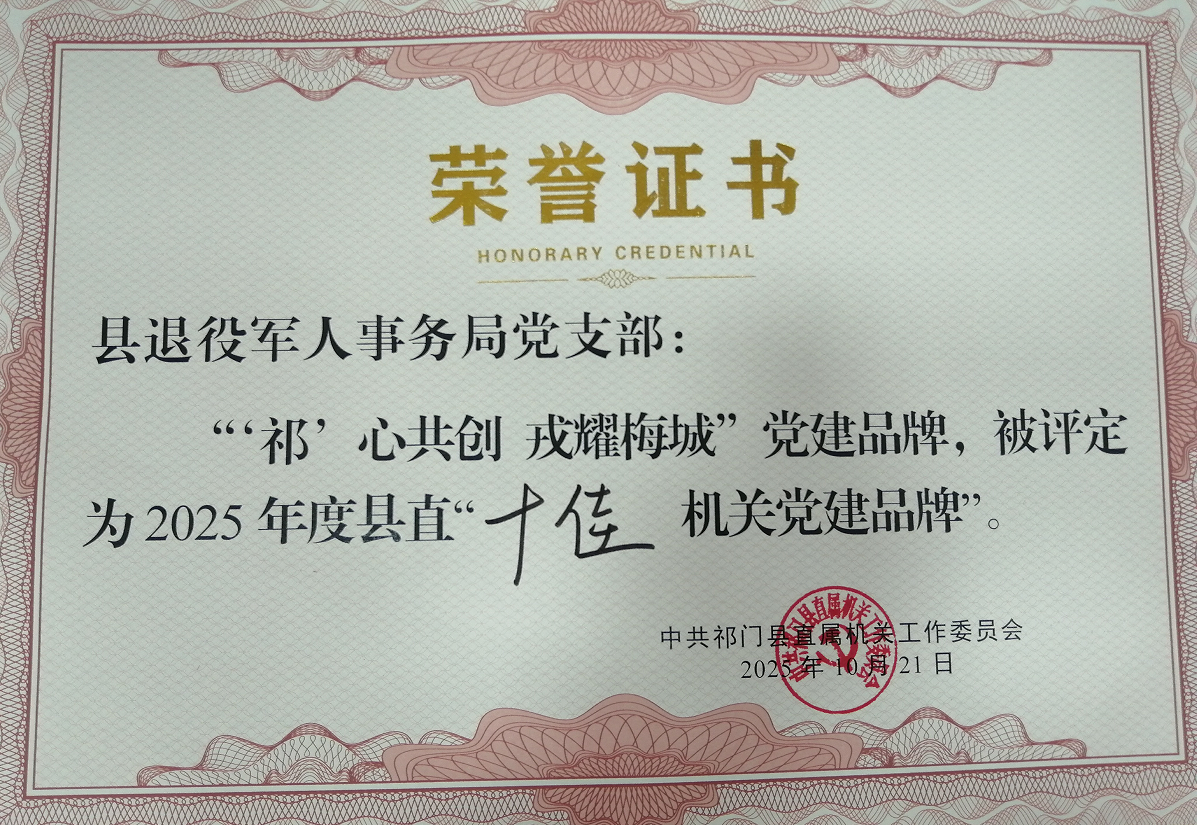 此次获评“十佳机关党建品牌”,既是对县退役军人事务局党建工作的充分肯定,也是对全县退役军人服务保障工作的认可。县退役军人事务局相关负责人表示,将以此次获奖为新的起点,持续深化“‘祁’心共创 戎耀梅城”品牌建设,不断提升党建工作质量,用心用情做好退役军人服务保障工作,为新时代祁门高质量发展贡献力量。(祝家勇)
