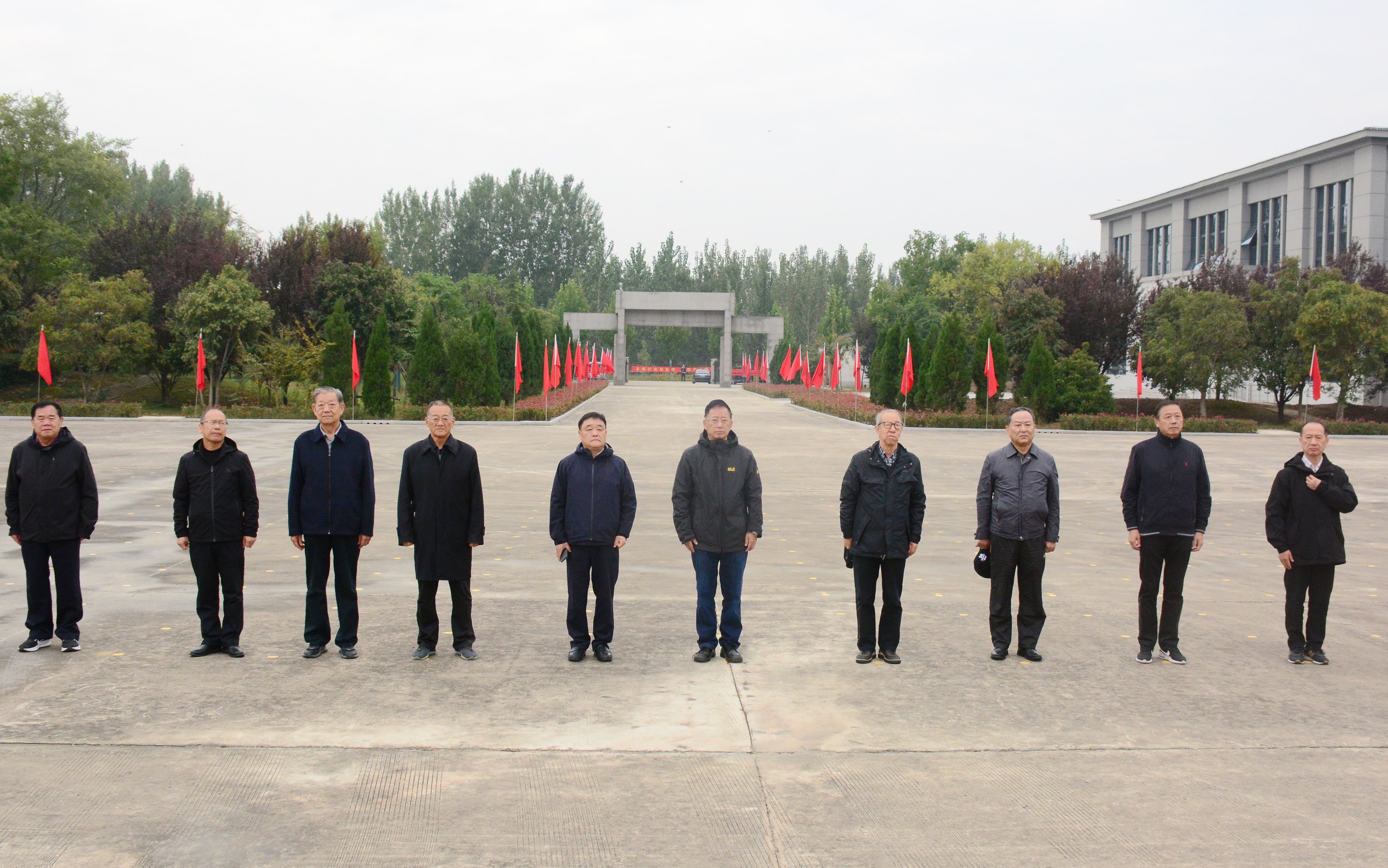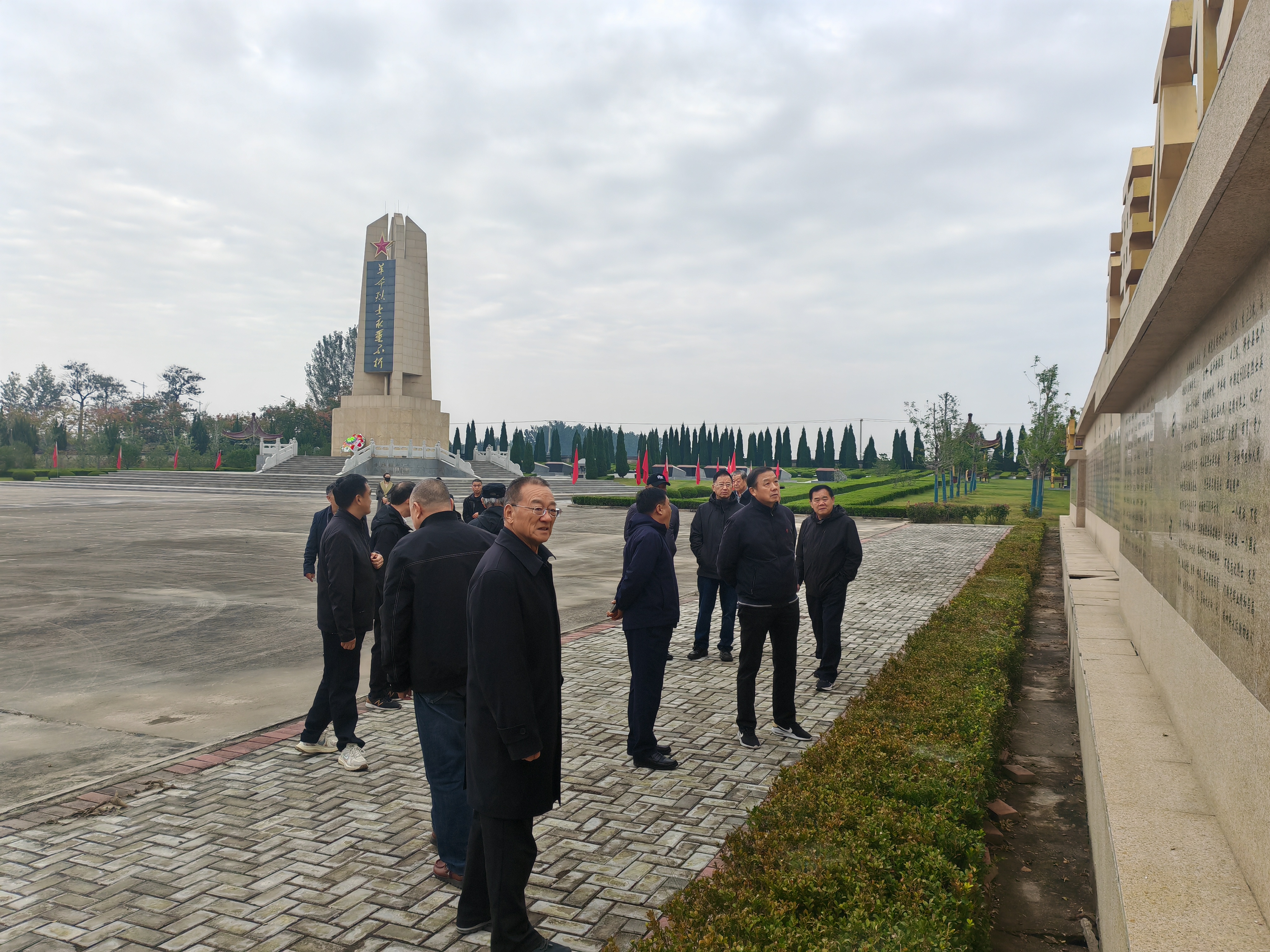调研组首站抵达砀山县烈士陵园。秋日下的陵园,松柏苍翠,肃穆宁静。桂建平副会长一行在人民英雄纪念碑前深切哀悼,敬献花篮,表达对烈士的崇敬,依次瞻仰烈士墓碑、烈士英名墙和烽火征程雕塑。