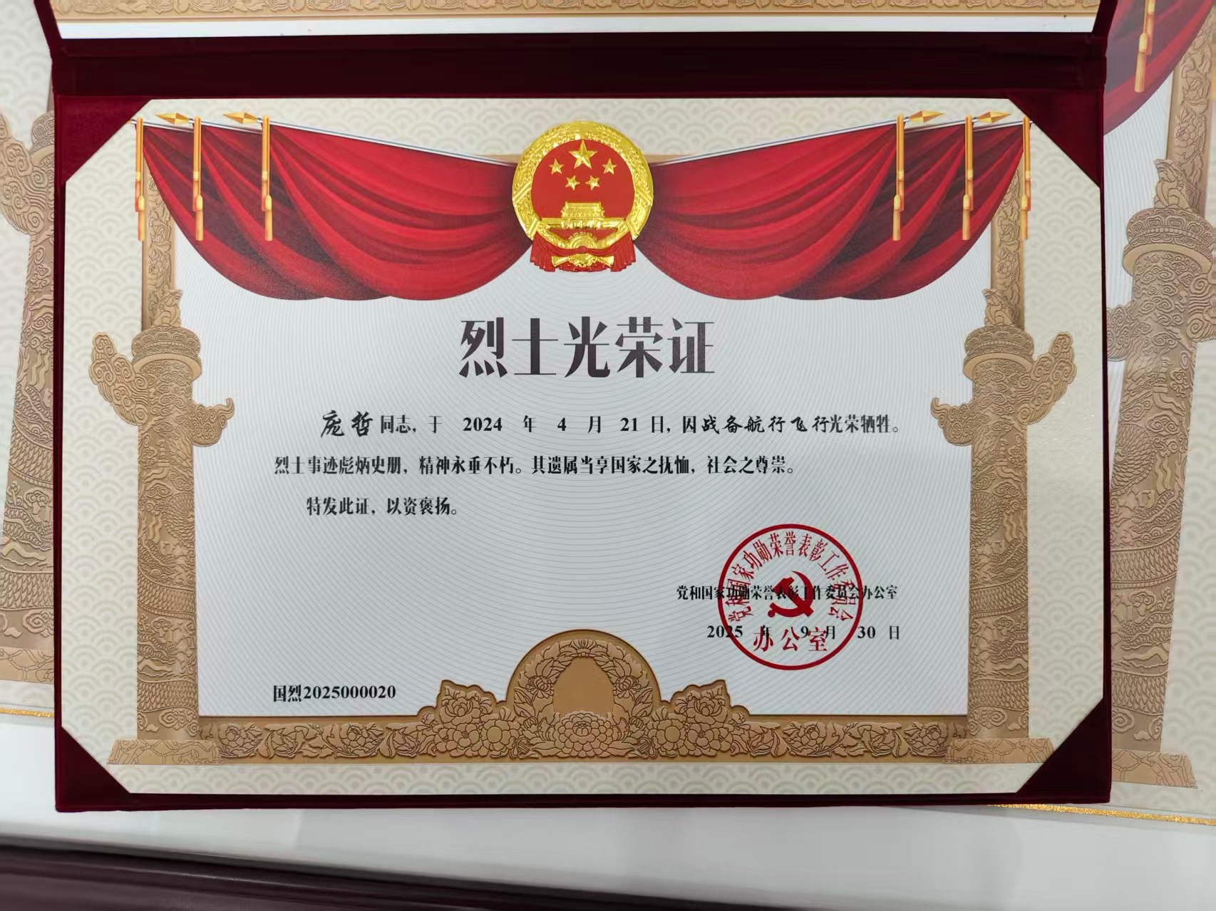 英雄已逝,精神长存。国家没有忘记英雄的奉献,人民没有忘记英雄的牺牲。2025年9月30日,党和国家功勋荣誉表彰工作委员会办公室专门为庞哲颁发了烈士光荣证,在我国第十二个烈士纪念日这个庄严的日子里,庞哲烈士光荣证发放仪式在安徽省退役军人事务厅举行。庞哲的父母怀着无比沉痛与自豪的复杂心情出席仪式,从省厅领导手中接过了这份承载着儿子赤胆忠心和无上荣光的证书。