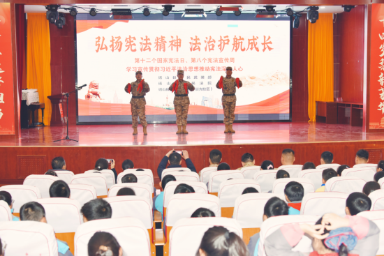 县人武部工作人员聚焦《中华人民共和国国防法》《中华人民共和国国防教育法》核心要点,向同学们介绍了国防的重要意义、我国国防建设的辉煌成就以及青少年在国防教育中的责任与义务,厚植爱国情怀。接着,县人武部民兵文艺小分队带来宪法宣传小快板,以欢快的节奏、朗朗上口的唱词将宪法知识融入表演,让同学们在轻松愉悦的氛围中加深对宪法精神的理解。