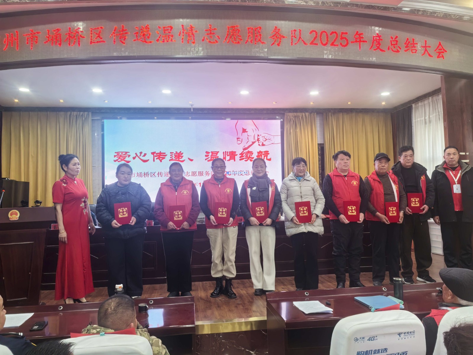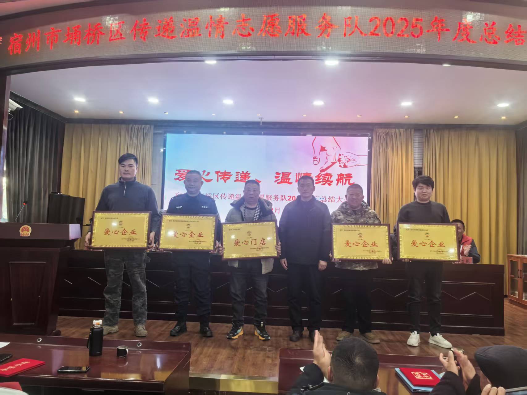 12月26日下午,宿州市埇桥区传递温情志愿服务队在朱仙庄镇政府礼堂召开年终总结会。会上为“最美志愿者”“爱心妈妈”“爱心企业”等奖项获得者颁发奖状,感谢他们辛勤的付出。埇桥区退役军人事务局党组成员、副局长郑达,朱仙庄镇党委委员、组织委员牛静出席会议并讲话,镇人大副主席曹婷婷参加会议并在主席台就坐。“最美志愿者”代表詹东体,“爱心妈妈”代表张丽先后上台发言。
