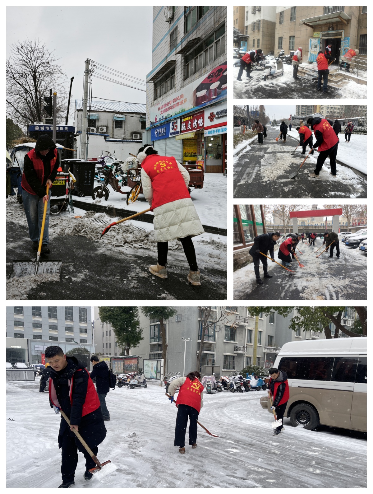 在奥林花园社区,全体工作人员与辖区退役军人志愿服务队,顶着寒风大雪,开展了一场热火朝天的铲雪除冰行动。