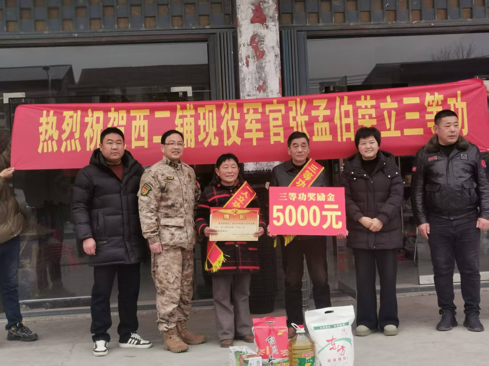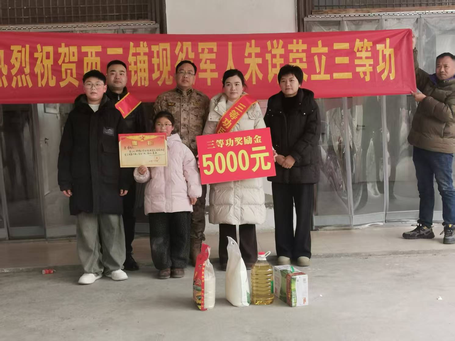 2月6日,宿州市埇桥区西二铺镇镇长刘玉丛、镇武装部长梁明、及退役军人服务站工作人员组成报喜队,带着慰问品来到现役军人朱详、张孟伯两位同志家中,将三等功喜报、立功奖章和慰问金送到军属手中,让亲人共享这份属于军人的荣耀与喜悦。