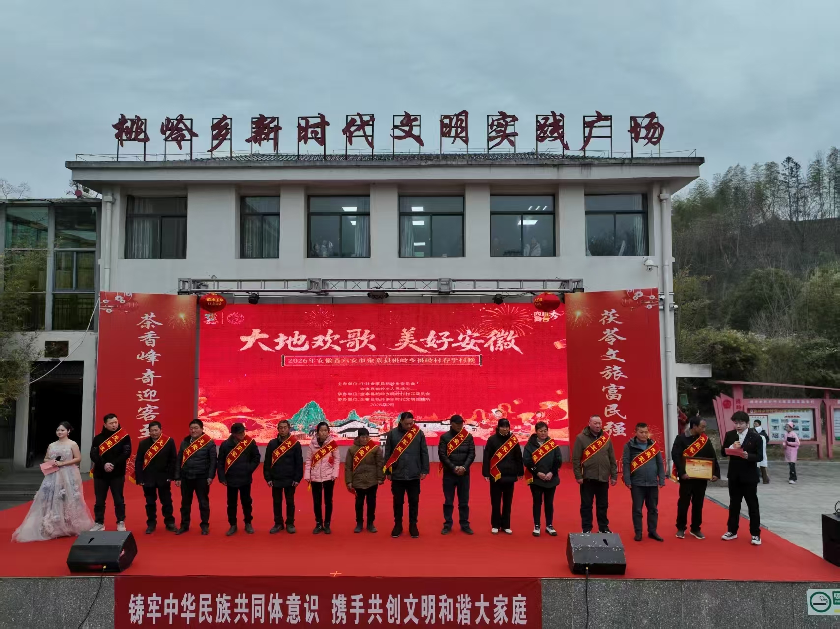表彰入伍新兵,激励启新程。在桃岭乡春节联欢晚会现场,桃岭乡集中表彰慰问2025年入伍新兵家属,送上慰问金和新春祝福,在晚会上高度赞扬新兵响应国家号召、投身国防建设的行为,肯定军属奉献精神,现场氛围庄重热烈,进一步营造“一人参军、全家光荣,一次参军、一生光荣”的浓厚氛围。