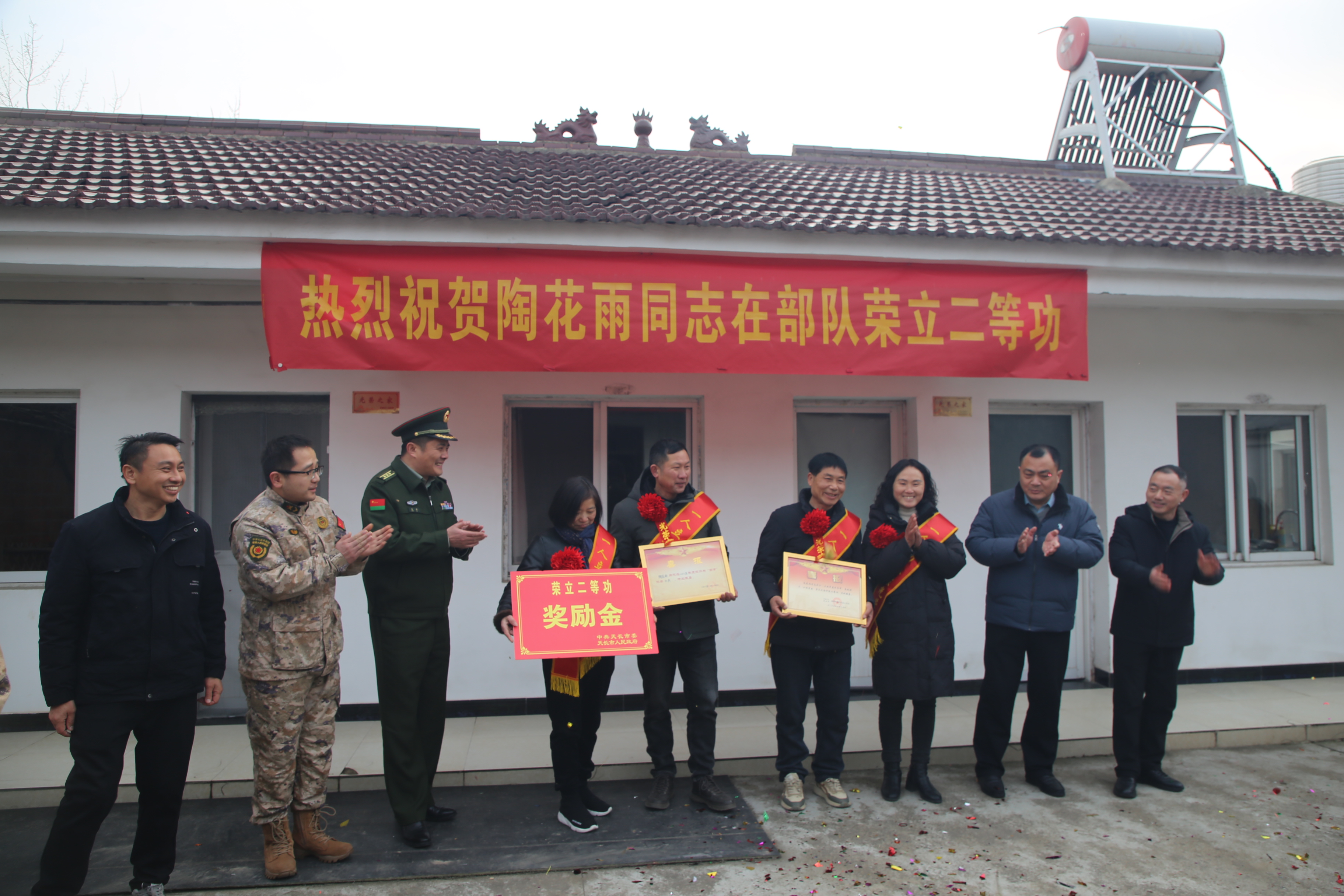随后,慰问组一行转往汊涧镇。从镇政府大院出发,陶花雨的父母和岳父母身披绶带、胸戴光荣花,走在送喜报队伍最前列。队伍经过主街道,再穿过小巷,锣鼓声、鞭炮声连绵不绝。军地领导深入陶花雨家小院表示祝贺,感谢他们为国防事业培养优秀人才。