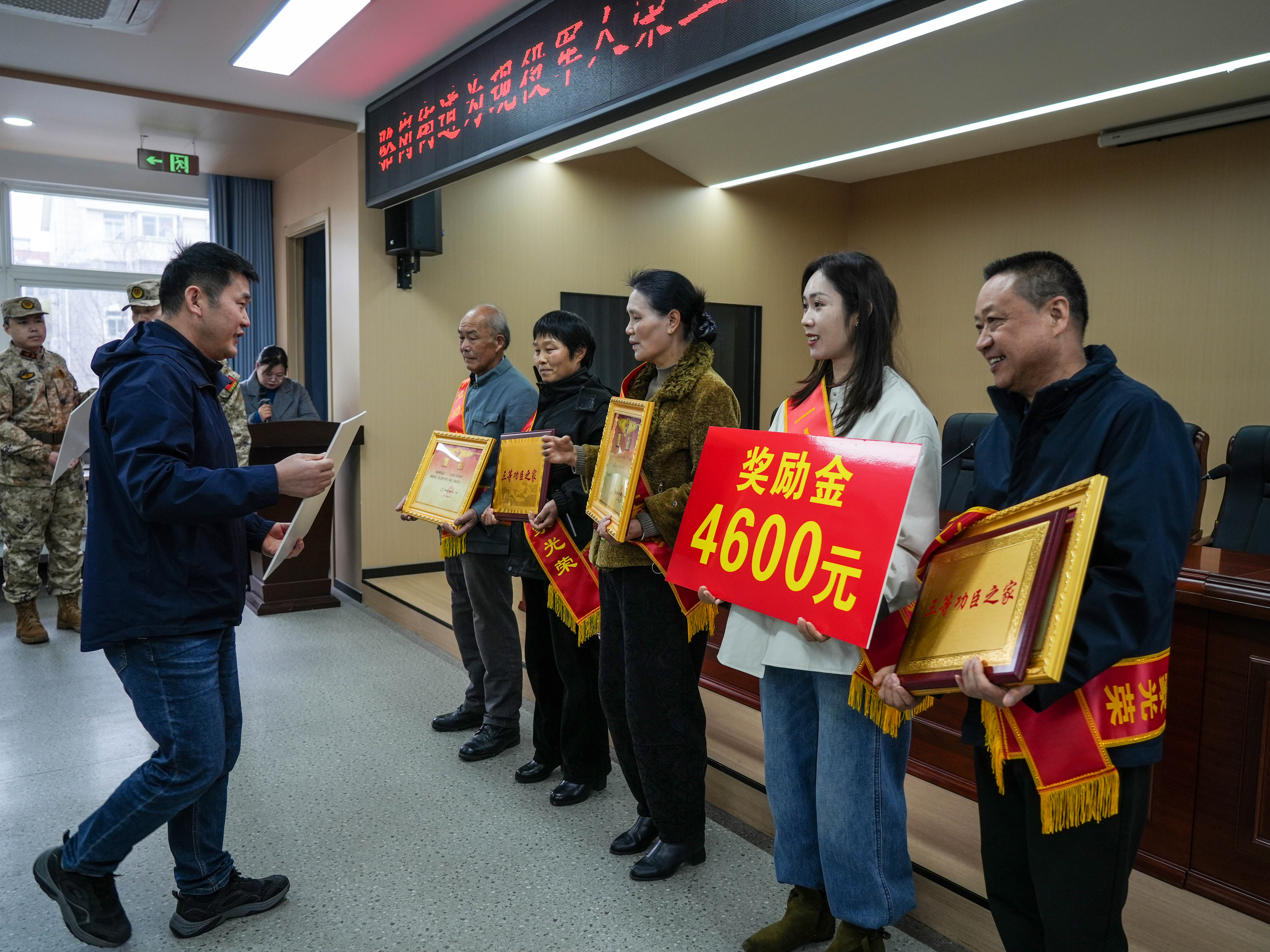 仪式上,区人武部负责人为家属授予立功牌匾,区退役军人事务局负责人递上立功喜报并送上奖励金,街道负责人为家属献上鲜花,每一个环节都庄重热烈,承载着对立功军人的敬意与对军属的关怀。