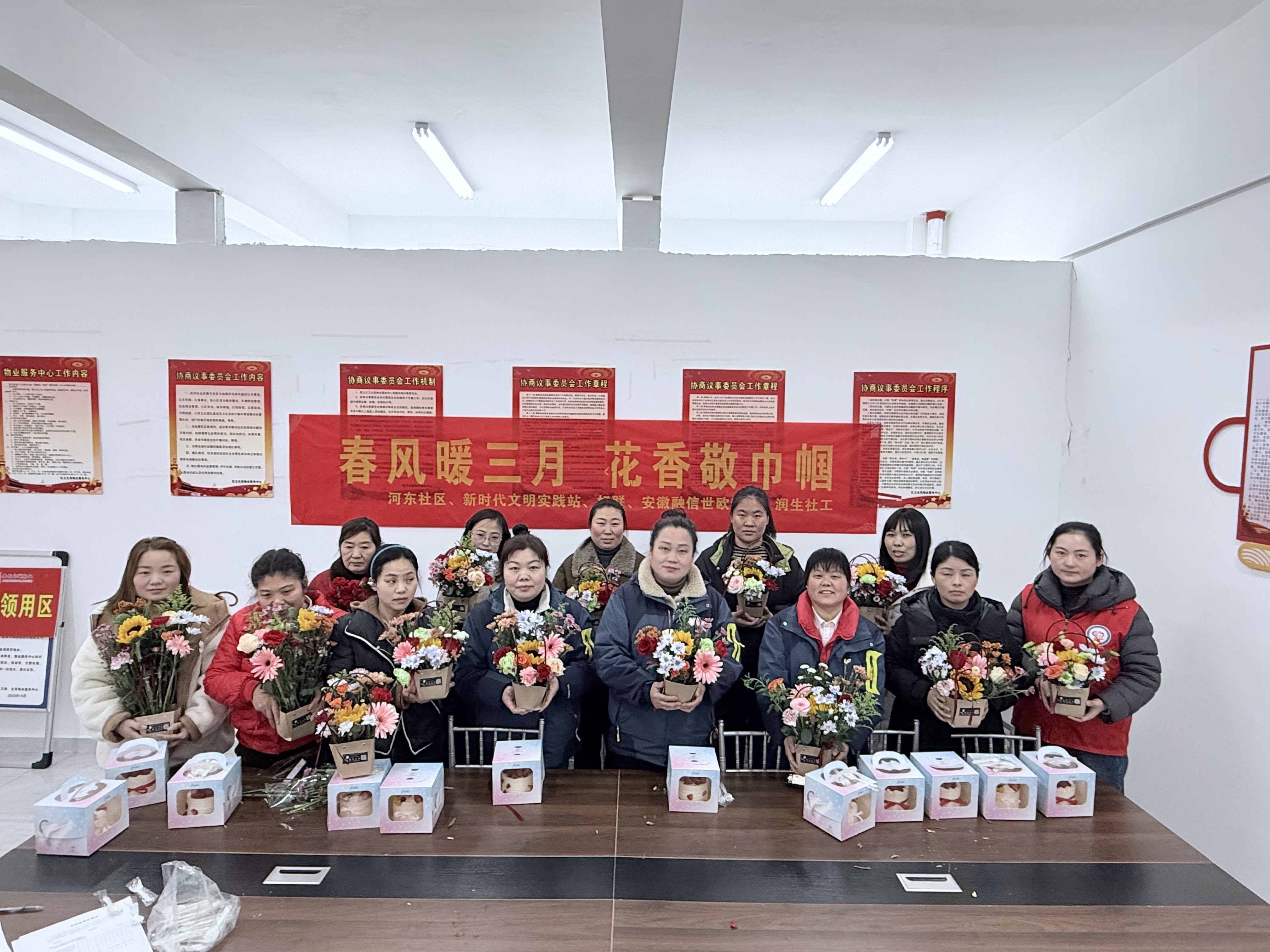 河东社区联合新时代文明实践站、妇联、物业及社工机构开展“春风暖三月 花香敬巾帼”主题插花活动。活动现场花香四溢,大家在花艺创作中交流生活心得、感受艺术魅力,在沉浸式体验中展现自信优雅的巾帼风采,进一步拉近了邻里距离,凝聚了社区温情。