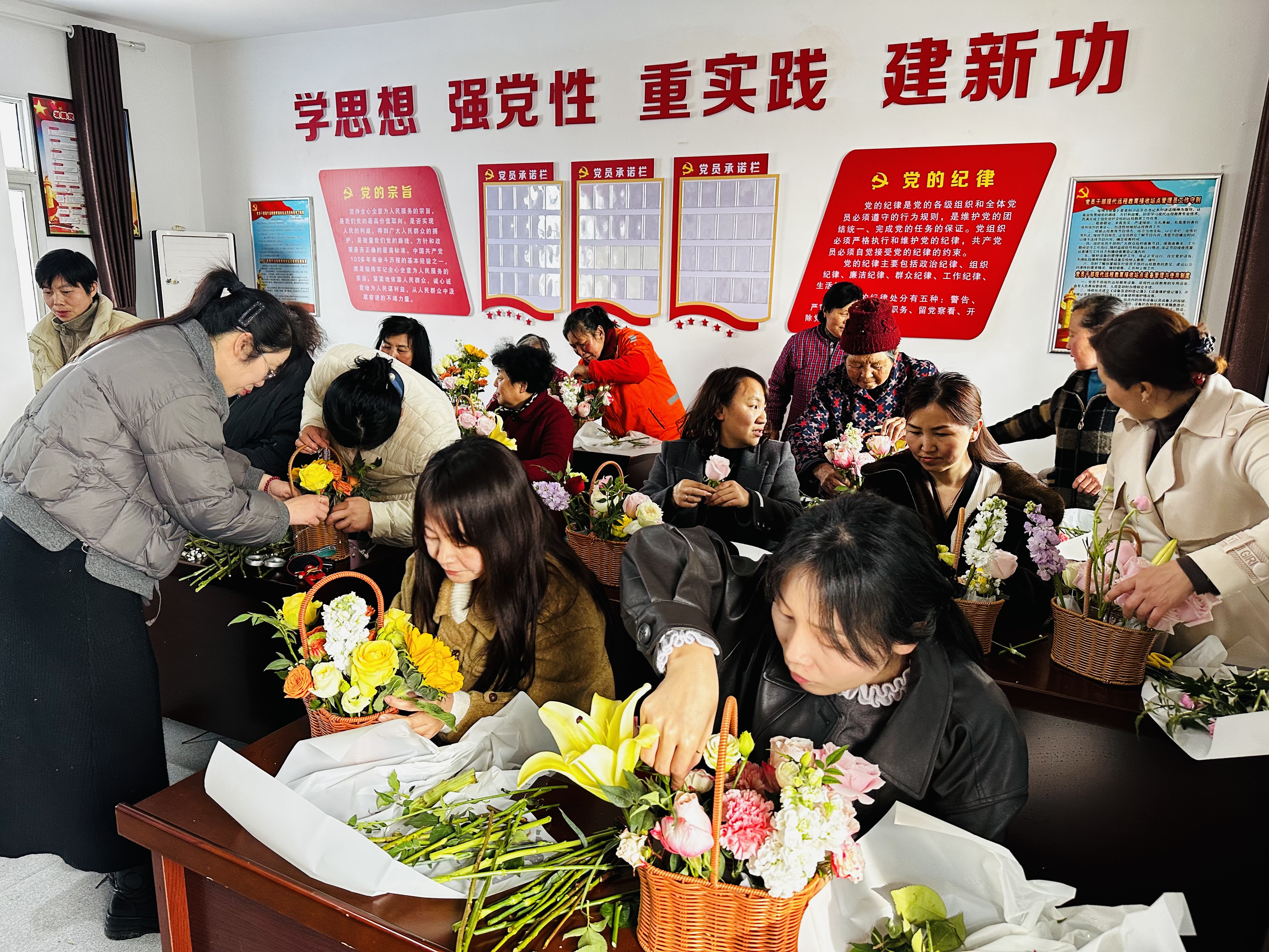 3月6日,江岗村党支部牵头、村妇联承办“花韵绽芳华,巾帼向未来”创意插花活动,邀请本村及邻村女性同胞共同参与。活动邀请花艺老师现场讲授花卉搭配、插花技巧,平日里忙于家务、农活的姐妹们化身为“花艺师”,创作出一件件错落有致的花艺作品。活动打破村域界限,既让大家学习了花艺技能,也架起了邻里友谊的桥梁。