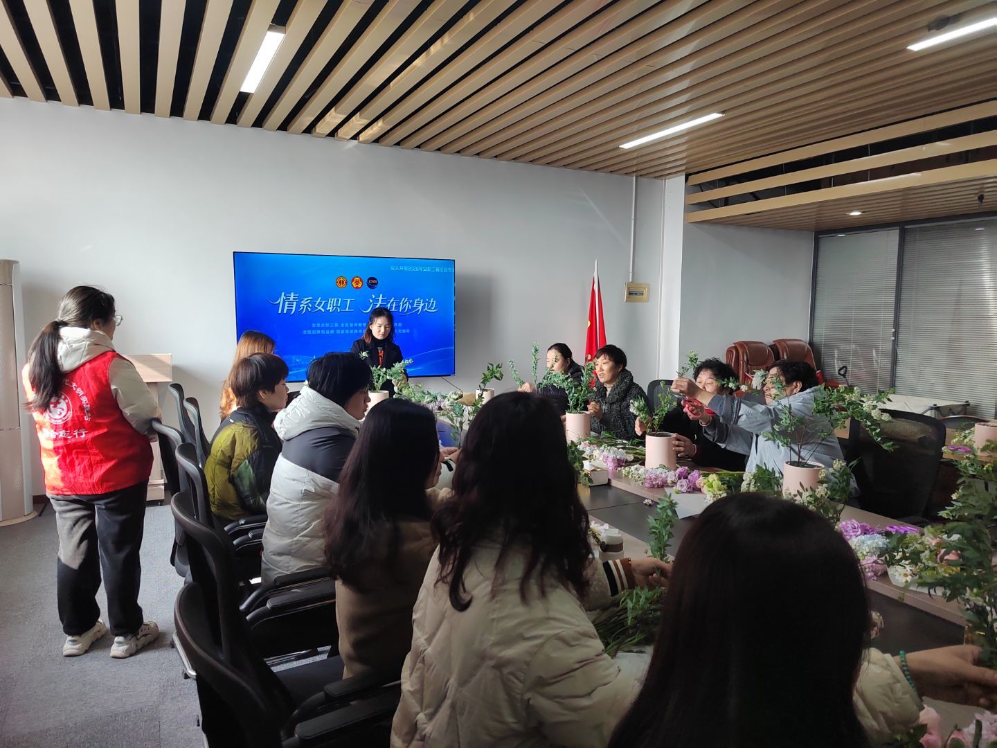 在楼宇党建阵地,一场聚焦职场女性的“楼宇巾帼心向党,法治春风润万家”主题活动同步开展。翡翠湖社区党委、新时代文明实践站与社区妇联携手,将普法宣传与花艺体验巧妙融合。活动现场,工作人员围绕妇女权益保障、反家庭暴力等热点问题进行面对面宣讲,引导女性职工增强法治意识和自我保护能力。随后的插花环节中,在专业老师的指导下,大家将手中的鲜花精心搭配,创作出一个个独具匠心的花艺作品。在花香与笑声中,楼宇女性职工们展现了昂扬向上、热爱生活的精神风貌。