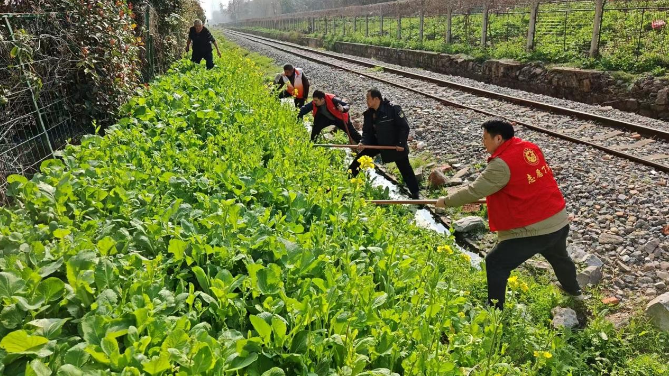 为保障铁路运输安全、消除沿线安全隐患,近日,合肥市蜀山区南七街道丁岗社区组织退役军人志愿者,开展铁路沿线环境整治专项行动,对铁路防护区内违规开垦的菜地进行集中清理,以实际行动守护铁路平安畅通。