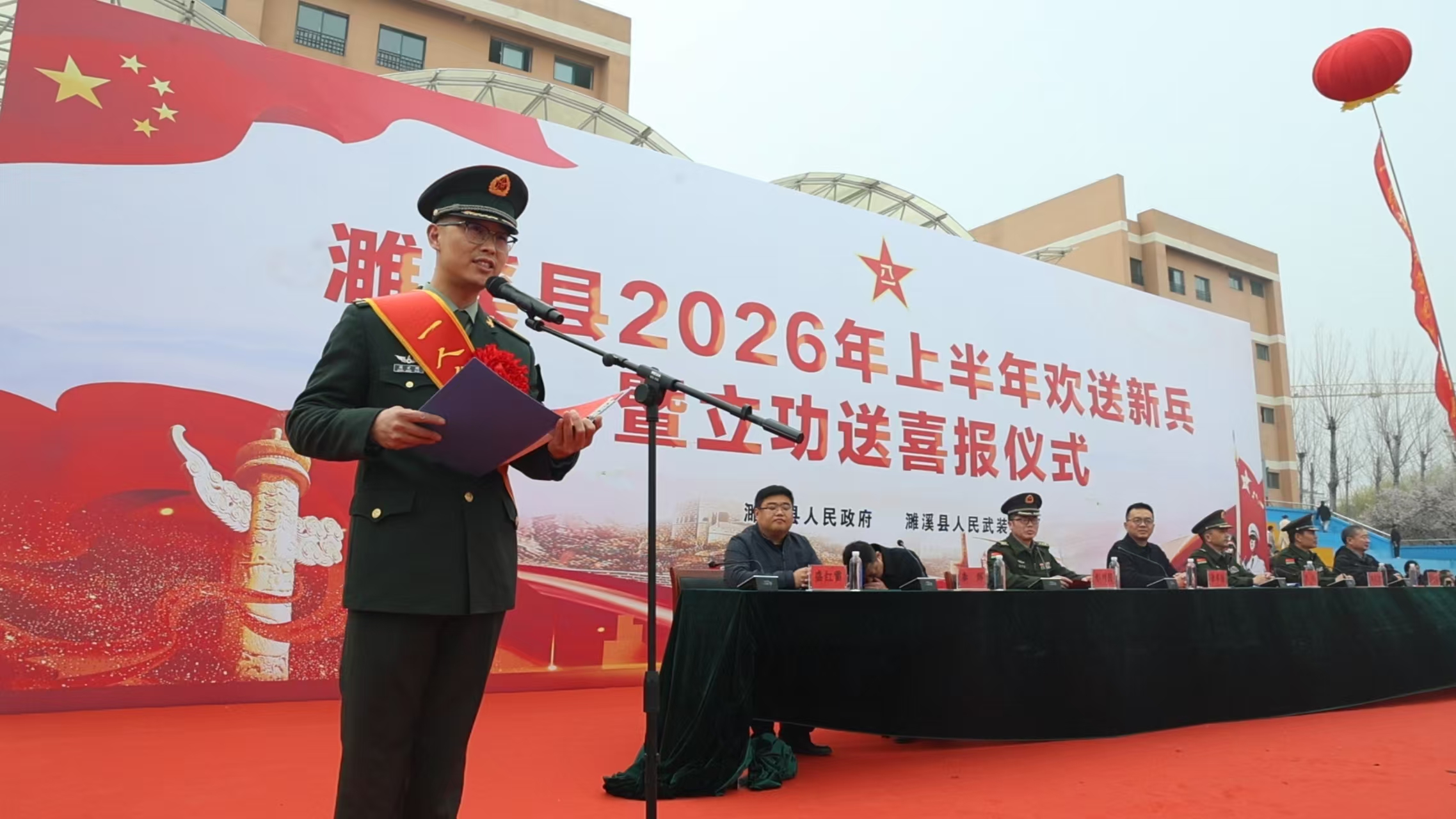 3月14日,濉溪县2026年上半年新兵欢送大会现场,韩村镇退役军人服务站联合县人武部,开展为立功受奖人员送喜报活动,把荣誉送到家,把嘱托送进心,积极营造“参军光荣、立功荣耀”浓厚氛围。