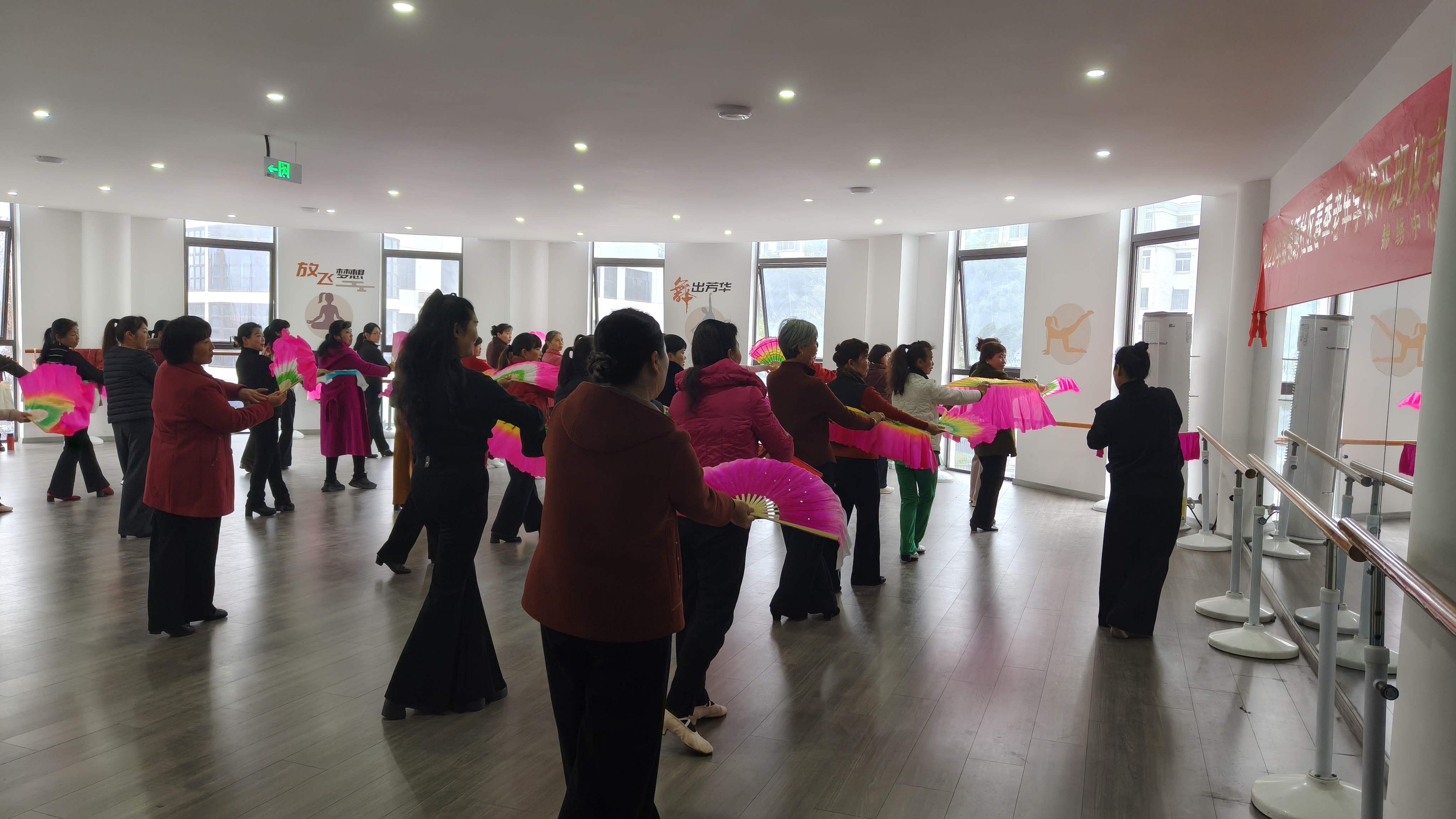 老师将动作分解,从最基本的步伐、甩扇、转身教起,耐心示范,逐排教学检查。学员们学习热情高涨,尽管起初步伐略显生涩,手势未能完全协调,但大家毫不气馁,反复练习,互相切磋。红绸翻飞,彩扇舞动,伴随着明快的节奏,阿姨们步伐越来越轻盈一时间,活动室内仿佛变成了欢乐的海洋,优美的舞姿与爽朗的笑声交织成一幅生动和谐的社区生活画卷。