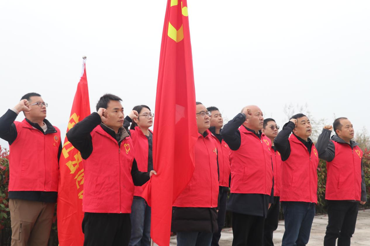陵园上空乌云低垂,苍松翠柏静默矗立,处处弥漫着肃穆庄重的氛围。党员干部们整齐列队,面向巍峨的烈士纪念碑肃立致敬,随后深深三鞠躬,依次上前献上鲜花,以此寄托对英烈的无限崇敬与深切追思。活动最后,大家在烈士纪念碑前高举右拳,重温入党誓词,庄严的宣誓声回荡在陵园上空。