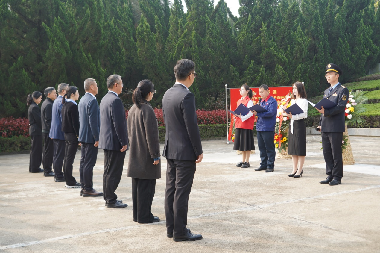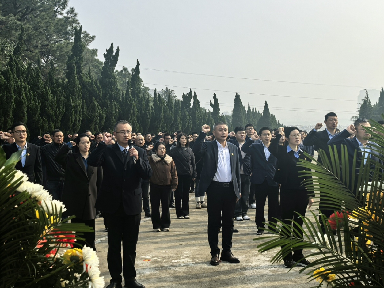 “全体肃立,奏唱《中华人民共和国国歌》!”上午8时30分,雄壮的《义勇军进行曲》在陵园上空响起。国歌唱毕,全体人员脱帽垂首,用最朴素的方式表达对英烈的崇高敬意。“我志愿加入中国共产党……”面向鲜红的党旗,全体党员高举右拳,重温入党誓词。誓言铮铮,在纪念碑前激荡回响,字字饱含对初心的叩问、对使命的铭记。